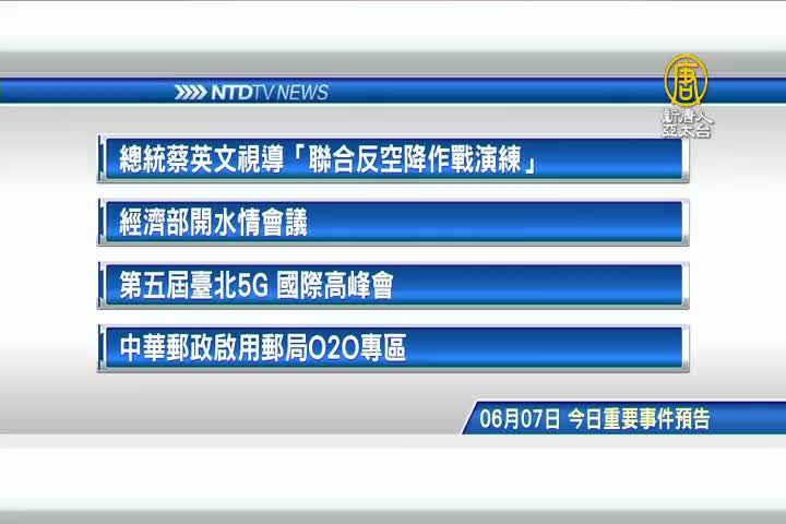 【新唐人亞太台 2018 年 06 月 07 日訊】接著看到,今天, 6月7日,星期四 ,有哪些重要活動。首先是,總統蔡英文視導「聯合反空降作戰演練」。再來是,經濟部召開水情會議。接著看到,第五屆臺北5G 國際高峰會。最後是,中華郵政啟用郵局O2O專區。