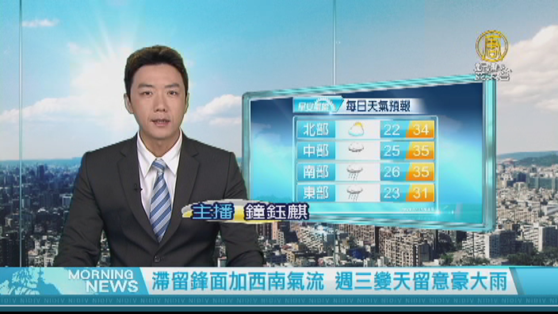 【新唐人亞太台 2018 年 06 月 12 日訊】歡迎您收看6月12日的早安新唐人,我是鐘鈺麒,先來帶您關心今天的天氣情況。 今天天氣各地晴朗穩定,西半部高溫在35度左右。不過,明天下半天起,西南氣流抵達,伴隨滯留鋒,天氣很不穩定,氣象專家提醒,留意有致災性的豪雨發生。帶您一起來看到國際媒體重要訊息。