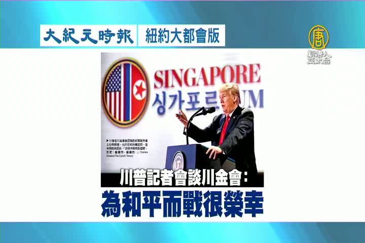【新唐人亞太台 2018 年 06 月 14 日訊】接著看到大紀元時報紐約大都會版報導:對於川金會,川普在記者會上表示,很榮幸為和平而戰。