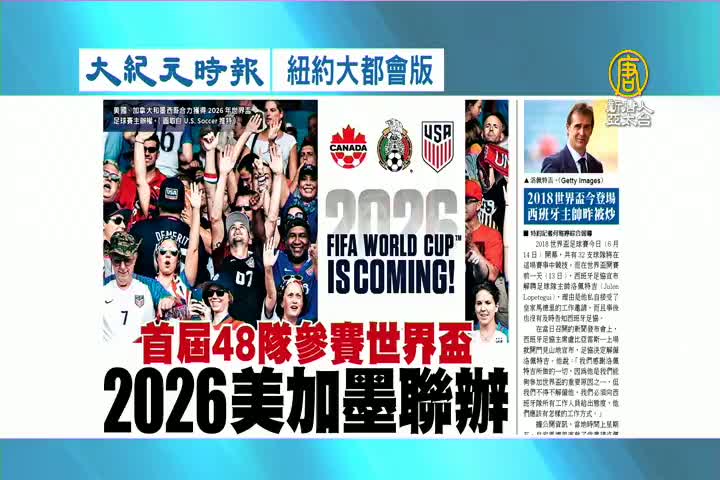【新唐人亞太台 2018 年 06 月 15 日訊】接著看到大紀元時報紐約大都會版報導:美加墨聯合主辦2026世界盃,將有48支球隊參賽。