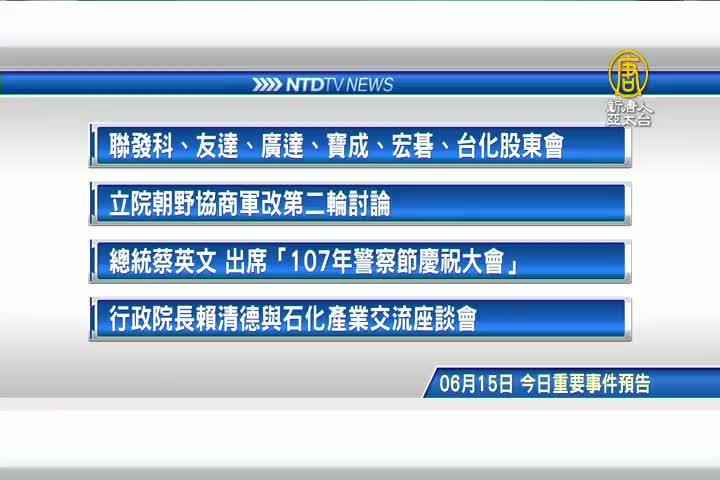 【新唐人亞太台 2018 年 06 月 15 日訊】接著看到,今天, 6月15日,星期五 ,有哪些重要活動。首先是,多家企業都在今天舉行股東會,包括聯發科、友達、廣達、寶成、宏碁與台化。再來是,立院朝野協商軍改第二輪討論。另外,總統蔡英文 今天出席「107年警察節慶祝大會」。最後是,行政院長賴清德今天與石化產業交流。