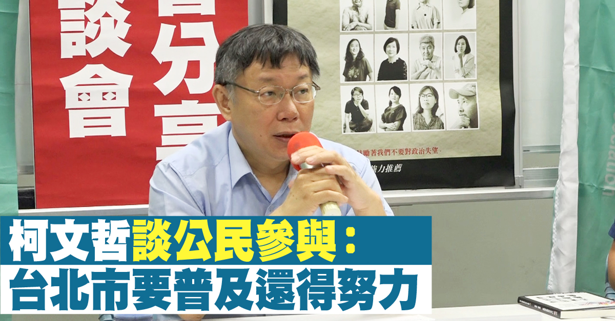 台北市長柯文哲,受邀參加座談會談公民參與,發言時提到,2014年投入選舉,政治訴求就是「開放政府、全民參與、公開透明」,上任一年後就開始推動參與式預算,現在已經約有11萬人參加。不過政治理念的傳播,需要時間,公民參與制度要普及化,還得努力。