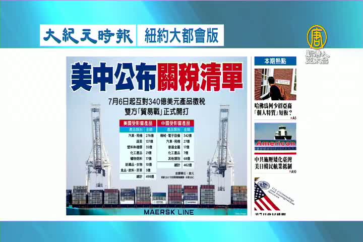 【新唐人亞太台 2018 年 06 月 18 日訊】接著看到大紀元時報紐約大都會版報導:美國與中國接連公布關稅清單,貿易戰正式開打。