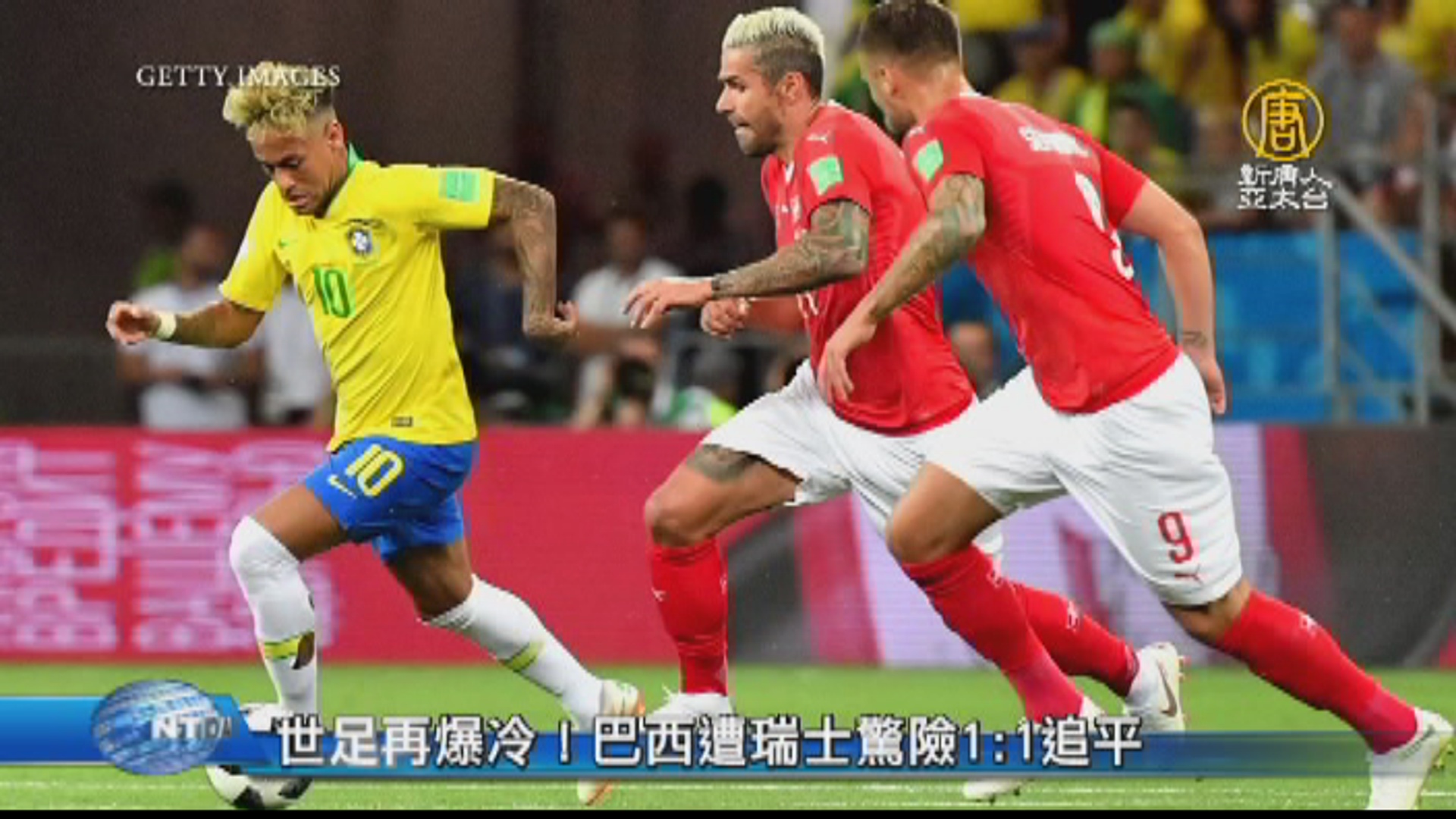 【新唐人亞太台 2018 年 06 月 18 日訊】歡迎回來,關心世足賽最新消息,今天台北時間凌晨兩點,擁有5座世界盃冠軍的巴西,面對防守實力不俗的瑞士,巴西全場攻勢不斷,上半場就踢進一球,下半場瑞士也把握角球機會,頭槌回敬一球,終場雙方以1:1踢成平手。而遭對手嚴厲看守的巴西大將內馬爾,本場屢遭拉扯、犯規,並無太多攻門表現。巴西下戰會在台灣時間22日晚上8點對上哥斯大黎加;瑞士則是在23日凌晨2點對塞爾維亞,爭取本屆首勝。