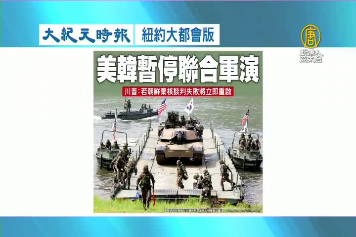 【新唐人亞太台 2018 年 06 月 19 日訊】接著看到大紀元時報紐約大都會版報導:美韓宣布暫停聯合軍演,川普表示,談判若失敗將立即重啟。