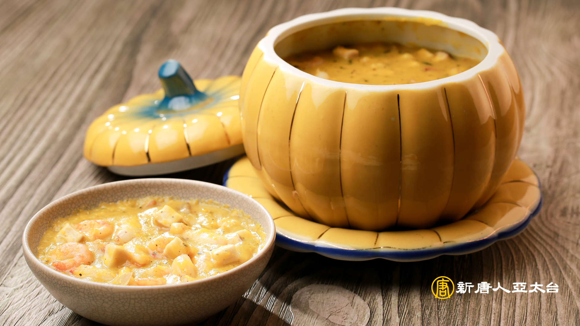 食材:南瓜800g、洋蔥丁60g、培根丁30g、杏鮑菇丁100g 、蝦仁 100g、蟹管肉60g、大骨蔬菜高湯1000g