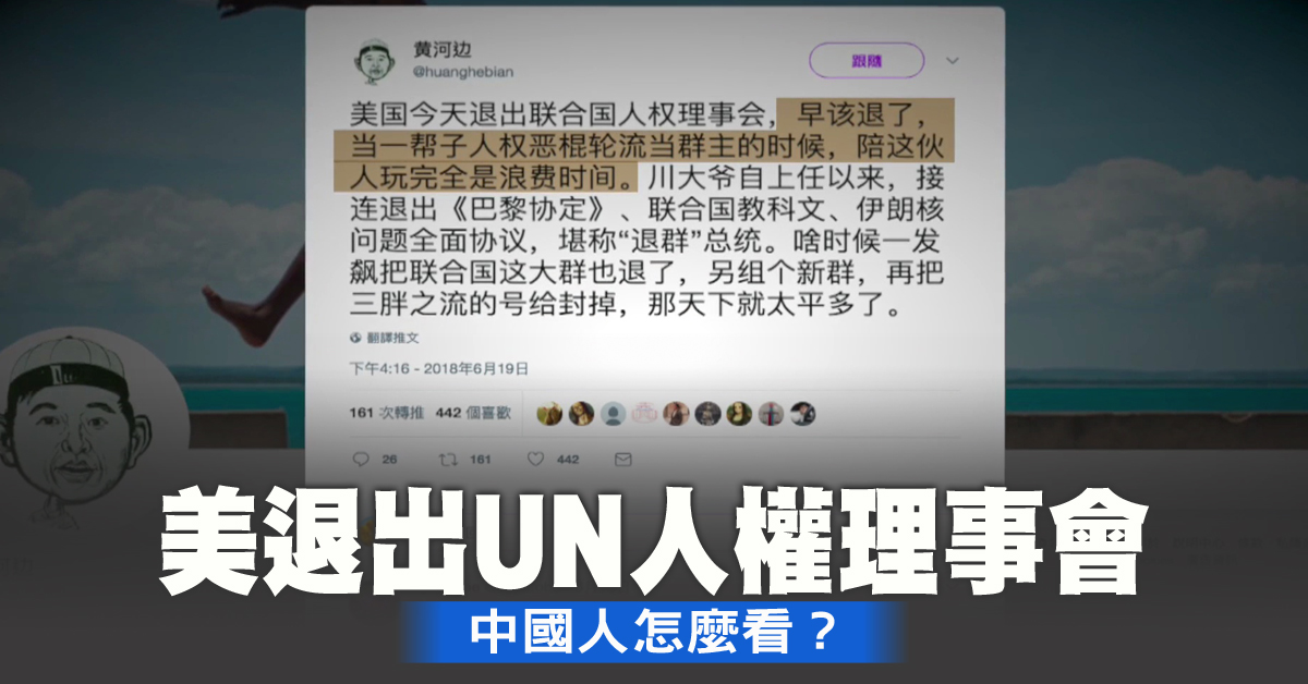 不少人在推特上對美國表示支持。有人說:「不是警察退縮而是流氓掌當權」。也有人說:「早該退了,當一幫子人權惡棍輪流當群主的時候,陪這伙人玩完全是浪費時間」。還有人說:「美國退出聯合國人權理事會恰恰說明了美國沒有操縱聯合國」