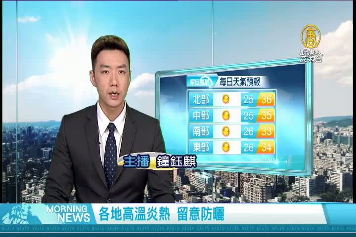 【新唐人亞太台 2018 年 06 月 26 日訊】歡迎您收看6月26日的早安新唐人,我是鐘鈺麒,先來帶您關心今天的天氣情況。今天天氣跟昨天類似,各地高溫炎熱,高溫大多可來到32度以上,大台北地區、西半部近山區、氣溫甚至可達35度以上,提醒您外出注意防曬並多補充水分。帶您一起來看到國際媒體重要訊息。