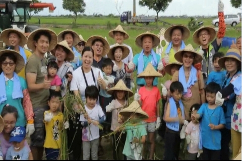 嘉義縣鹿草鄉農會舉辦割稻體驗活動,會後大合影。(翁章梁團隊提供)