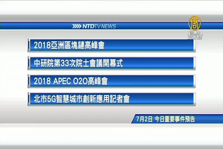 【新唐人亞太台 2018 年 07 月 02 日訊】接著看到,今天,7月2日,星期一 ,有哪些重要活動。首先是,2018亞洲區塊鏈高峰會;總統蔡英文,出席「中研院第33次院士會議開幕式」;經濟部長沈榮津,出席2018 APEC O2O高峰會;以及北市5G智慧城市創新應用記者會。
