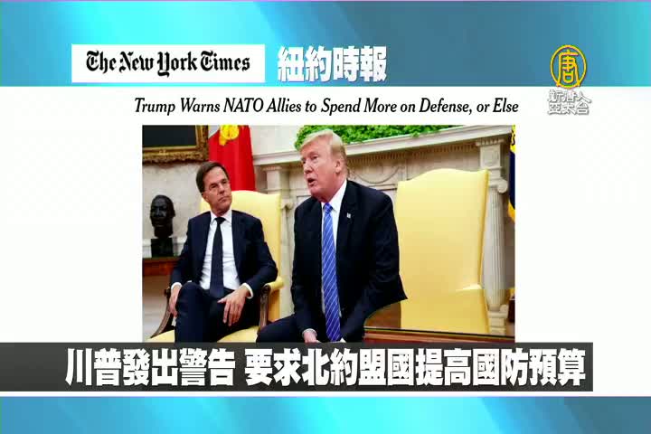 【新唐人亞太台 2018 年 07 月 04 日訊】首先來看到美國紐約時報報導:美國總統川普發出警告,要求北約各國提高國防預算。