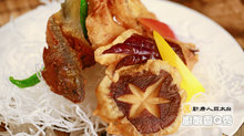 4.準備炸油,以油溫約160-180度進行操作。香魚骨下鍋油炸至酥脆。依序沾麵糊的茄子、香菇酥炸,熟了即可先拿起。
