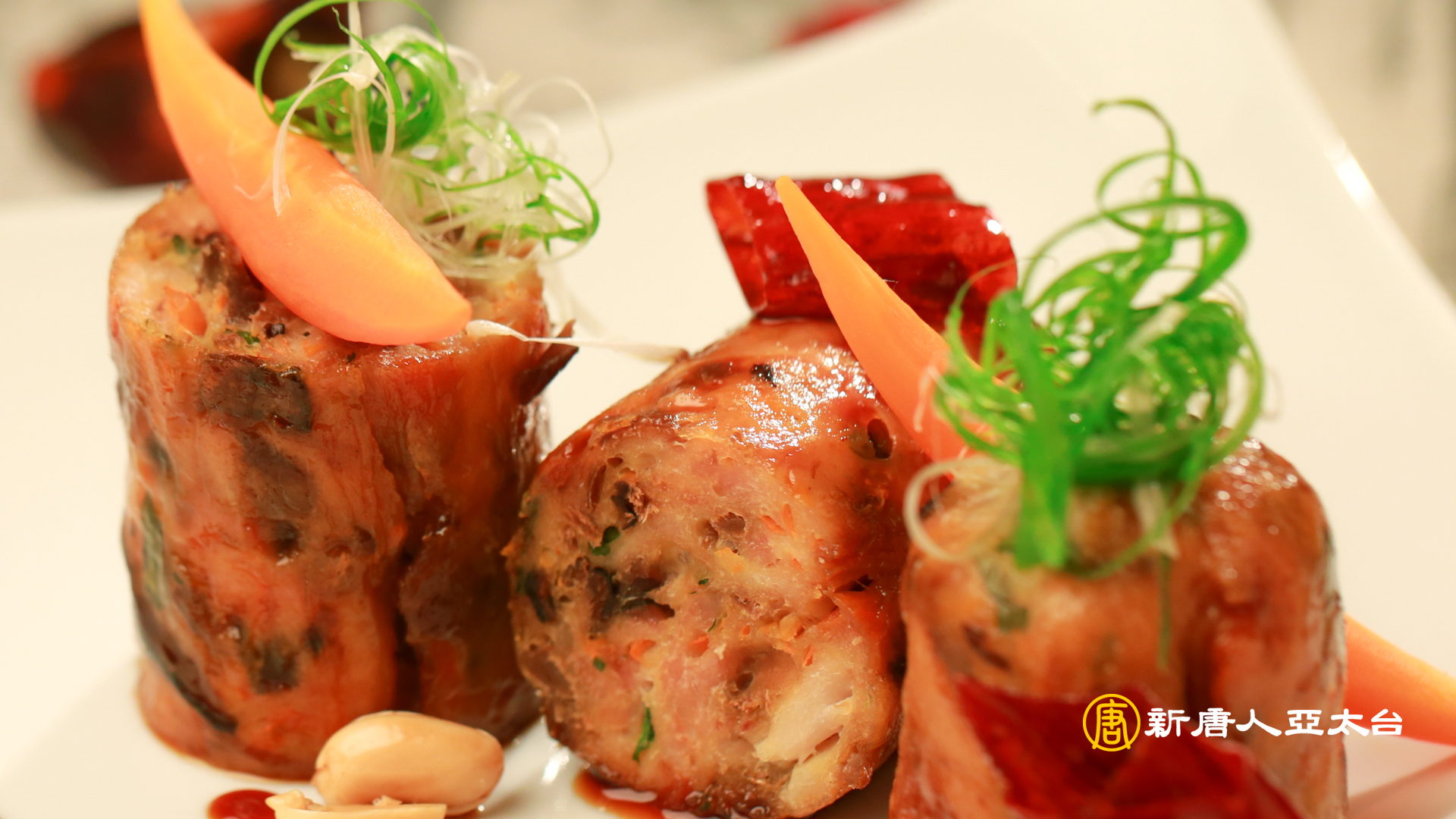 4.雞肉切三等份,再淋上些湯汁。擺盤再放上些宮保、花生及蔥絲。