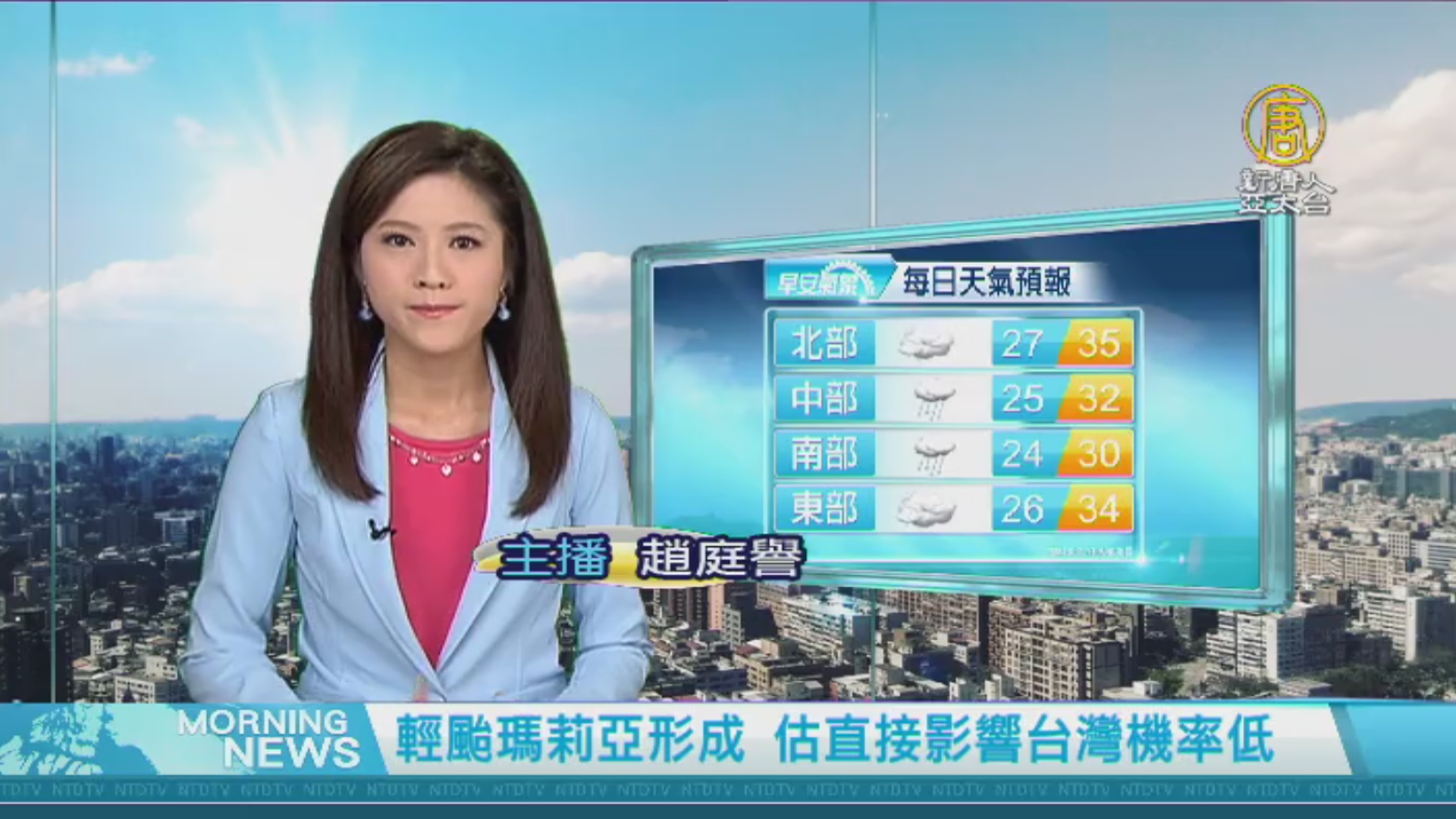 【新唐人亞太台 2018 年 07 月 05 日訊】歡迎您收看7月5日的早安新唐人,我是趙庭譽。先來帶您關心今天的天氣情況。今天西南風減弱,各地維持多雲到晴的天氣,中南部上午仍可能有局部短暫陣雨或雷雨。另外,第8號「瑪莉亞」颱風,昨晚在關島北部生成,正朝著西北方向,往琉球一帶前進,目前對台灣天氣沒有直接影響,後續動態及路徑氣象局會密切注意。帶您一起來看到國際媒體重要訊息。