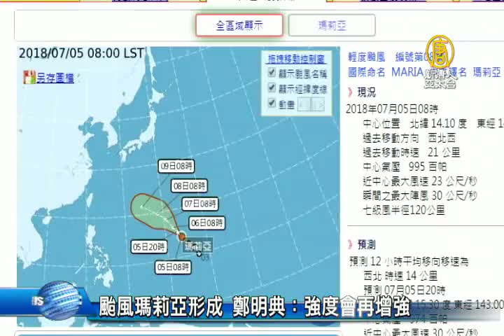 【新唐人亞太台 2018 年 07 月 05 日訊】來關心天氣,今年第8號颱風瑪莉亞已經在昨天晚間形成,氣象局副局長鄭明典在臉書表示,輕颱瑪莉亞,預期很快會進入快速發展期,強度會再增強,但短期內對台灣沒有影響。另外受到西南風影響,氣象局持續針對高雄及台南地區發布大雨特報,屏東縣則是豪雨特報,造成東港及林邊部分道路積水,交通管制無法通行。