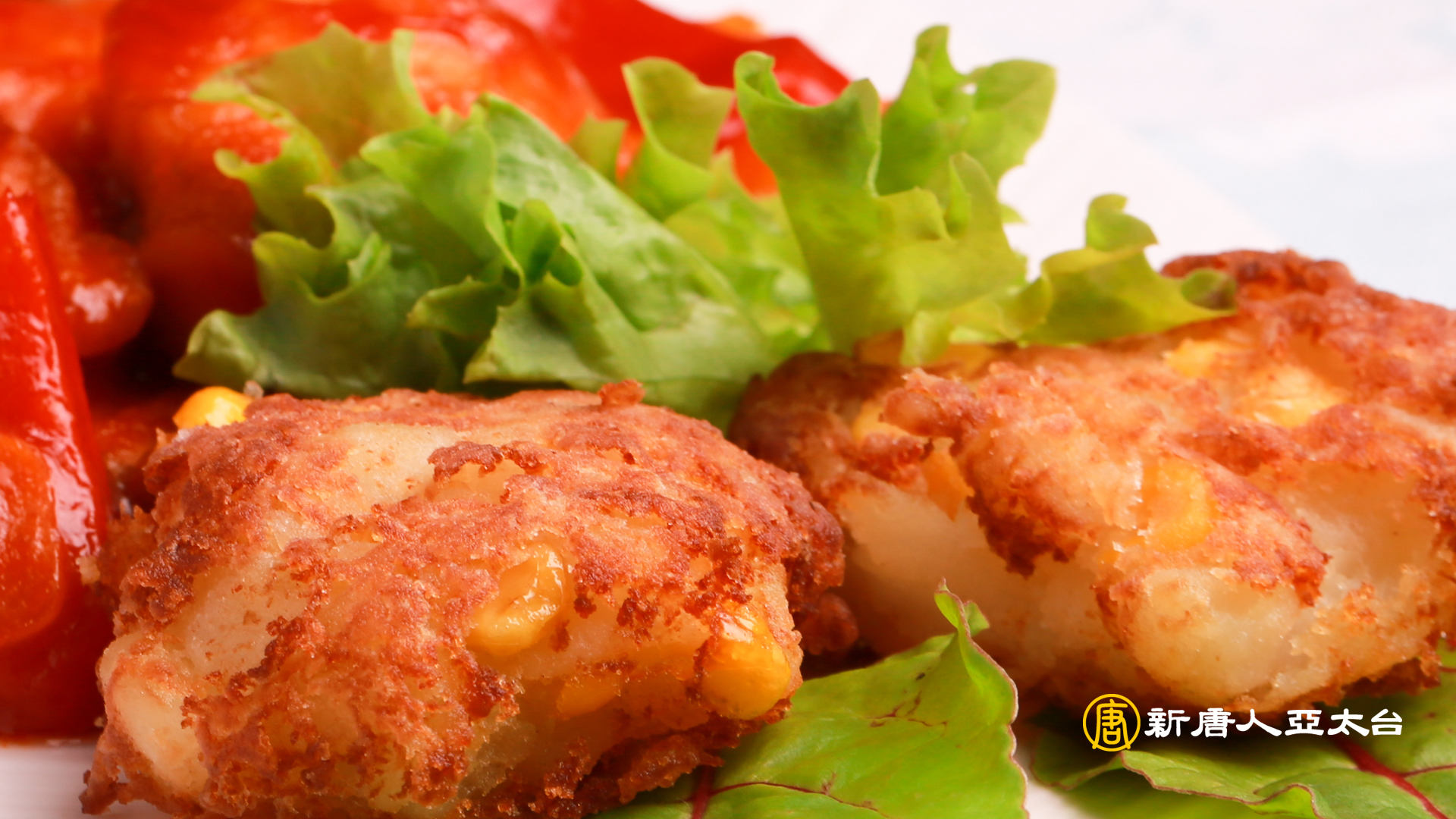材料:鯛魚片半片、東方美人茶15g、紅椒片10g、黃椒片10g、鹽適量、糖適量、米酒適量、麵粉適量、番茄醬適量、白醋適量、馬鈴薯30g、罐頭玉米5g、麵粉適量、菇類3g、黑胡椒1g