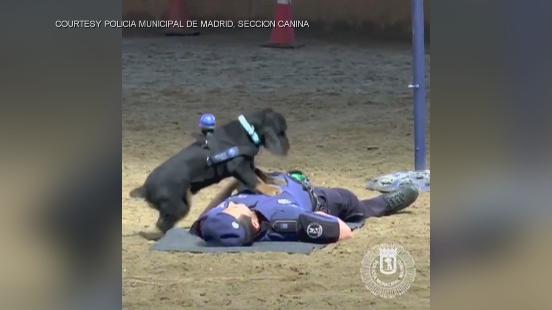 西班牙馬德里市警局的一場急救演習中,一名員警假裝昏死倒地,這時,配有專屬警燈的警犬龐丘(Poncho),立刻狂奔到員警身邊,進行急救。