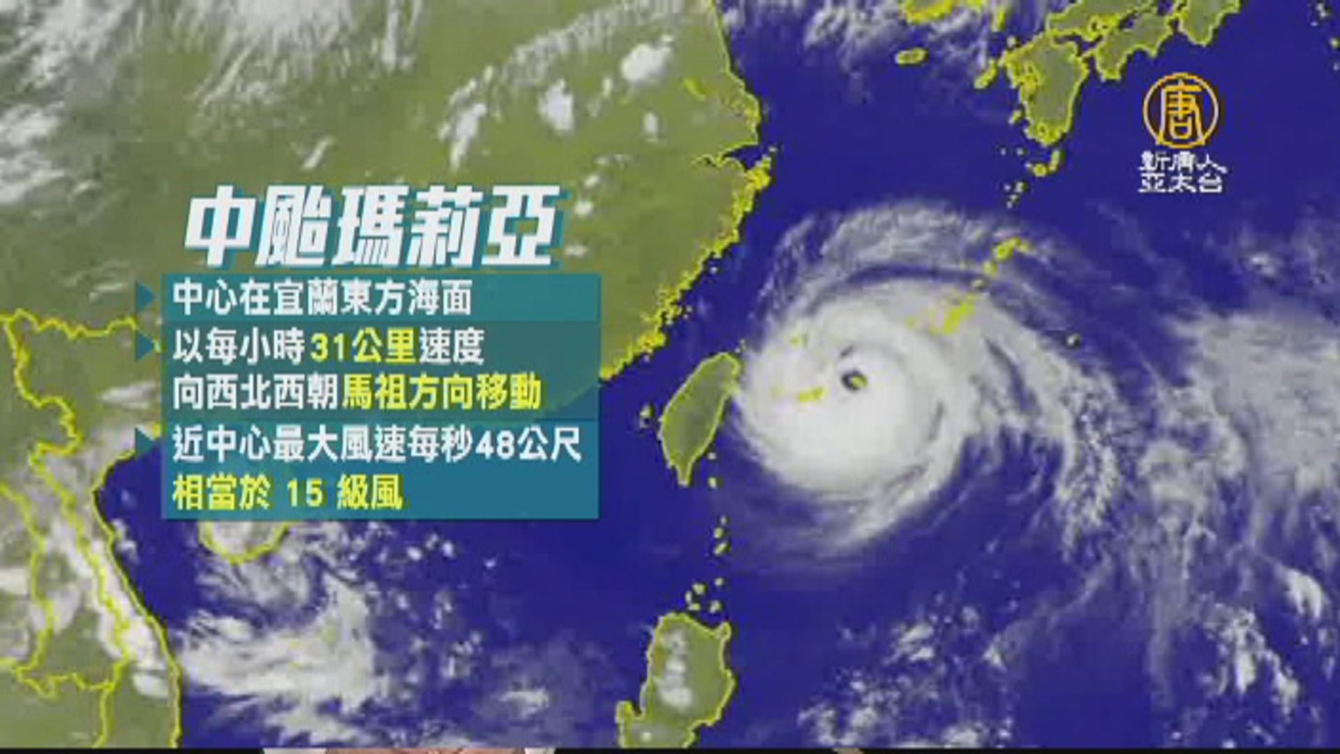 瑪莉亞颱風,在傍晚五點左右減弱為中颱,目前中心在宜蘭東方海面,以每小時31公里速度,向西北西朝馬祖方向移動,近中心最大風速每秒48公尺,相當於 15 級風,七級風暴風半徑達280公里,仍維持不變。