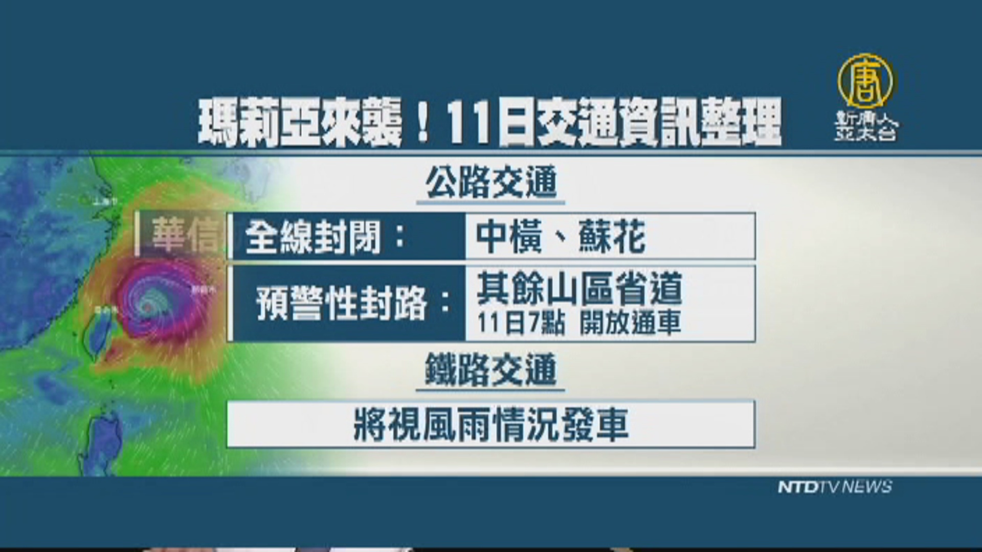 【新唐人亞太台 2018 年 07 月 10 日訊】中颱瑪莉亞,已經登陸台灣,目前可以說是,越晚風雨越大。今天深夜到明天清晨,將是瑪莉亞颱風影響最劇烈的時候,多數交通工具今晚都停駛停航,交通大亂,明天的交通資訊,為您快速整理。
