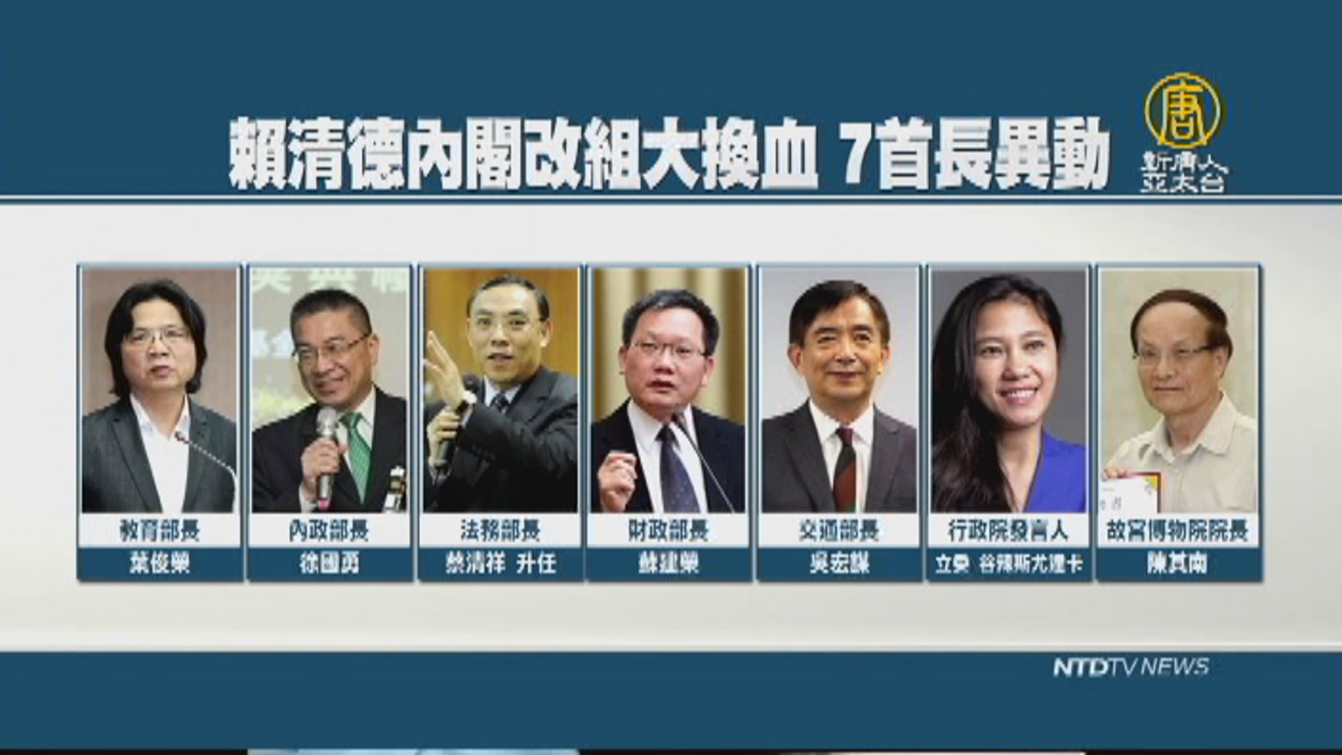 【新唐人亞太台 2018 年 07 月 12 日訊】火線新聞,來看到,行政院今天(12日)公布內閣改組名單,院長賴清德親自宣佈七個部會首長人事異動。賴清德說,內閣人事變動是依照政府執政的節奏,肯定閣員過去兩年表現,表示政府下階段重點,將會是落實執行政務。我們今天的,頭條報導。