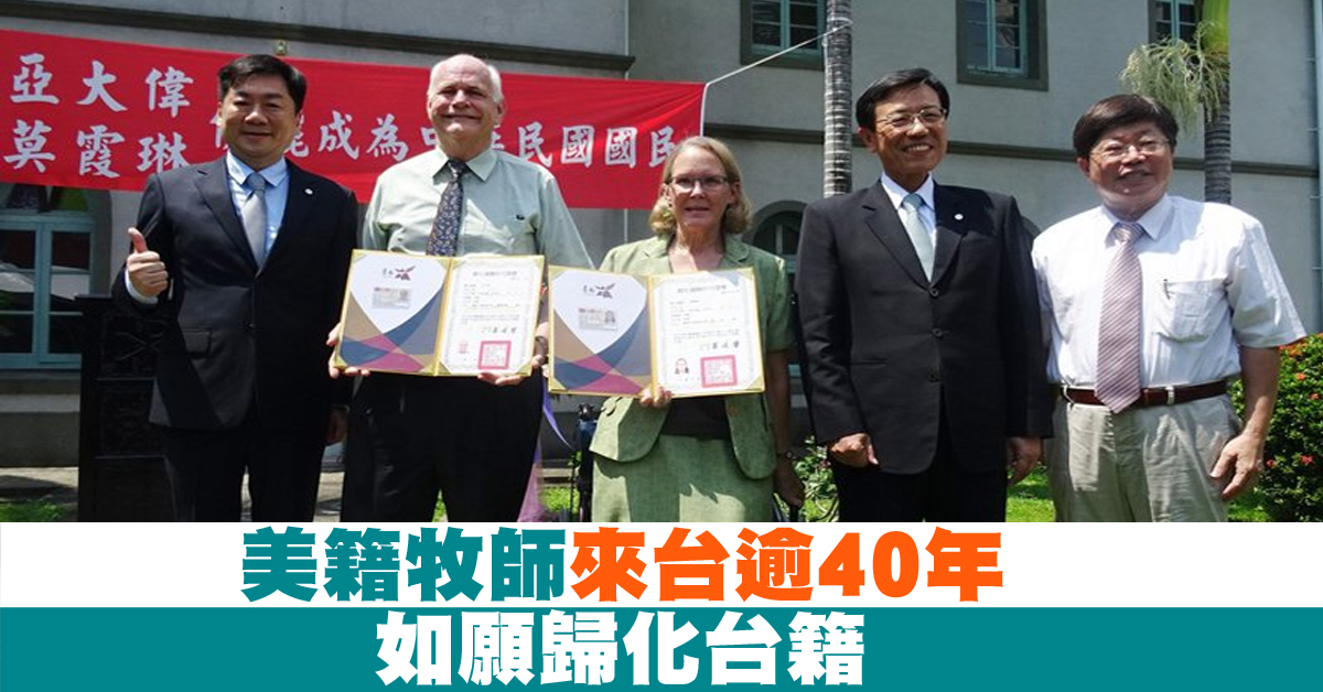 【新唐人亞太台 2018 年 07 月 14 日訊】來自美國的傳教士亞大偉,和他的妻子莫霞琳來台傳教,教書超過40年,台語說得比時下一些年輕人還要溜,在他們心中早就認定自己是台灣人,台南神學院為了給這對真正愛台灣的美籍夫妻一個驚喜,幫他們申請歸化台灣籍,今天他們正式獲得了身分證和戶口名簿。