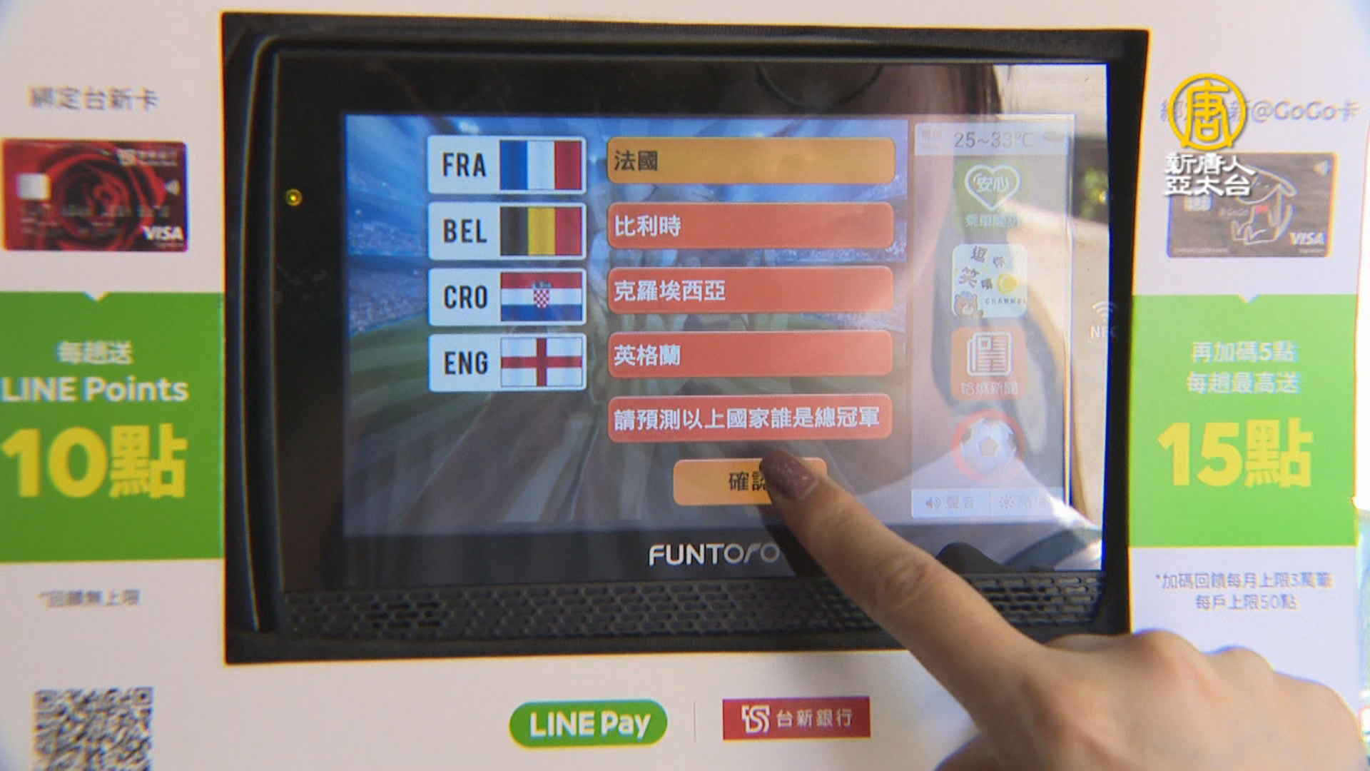 民眾也能在車上瘋世足!看準世足賽熱潮,業者推出預測冠軍活動,只要在車子後座螢幕點選足球ICON,支持的隊伍,再輸入手機號碼供系統回傳,就能參加最大獎10萬元乘車券優惠抽獎活動。