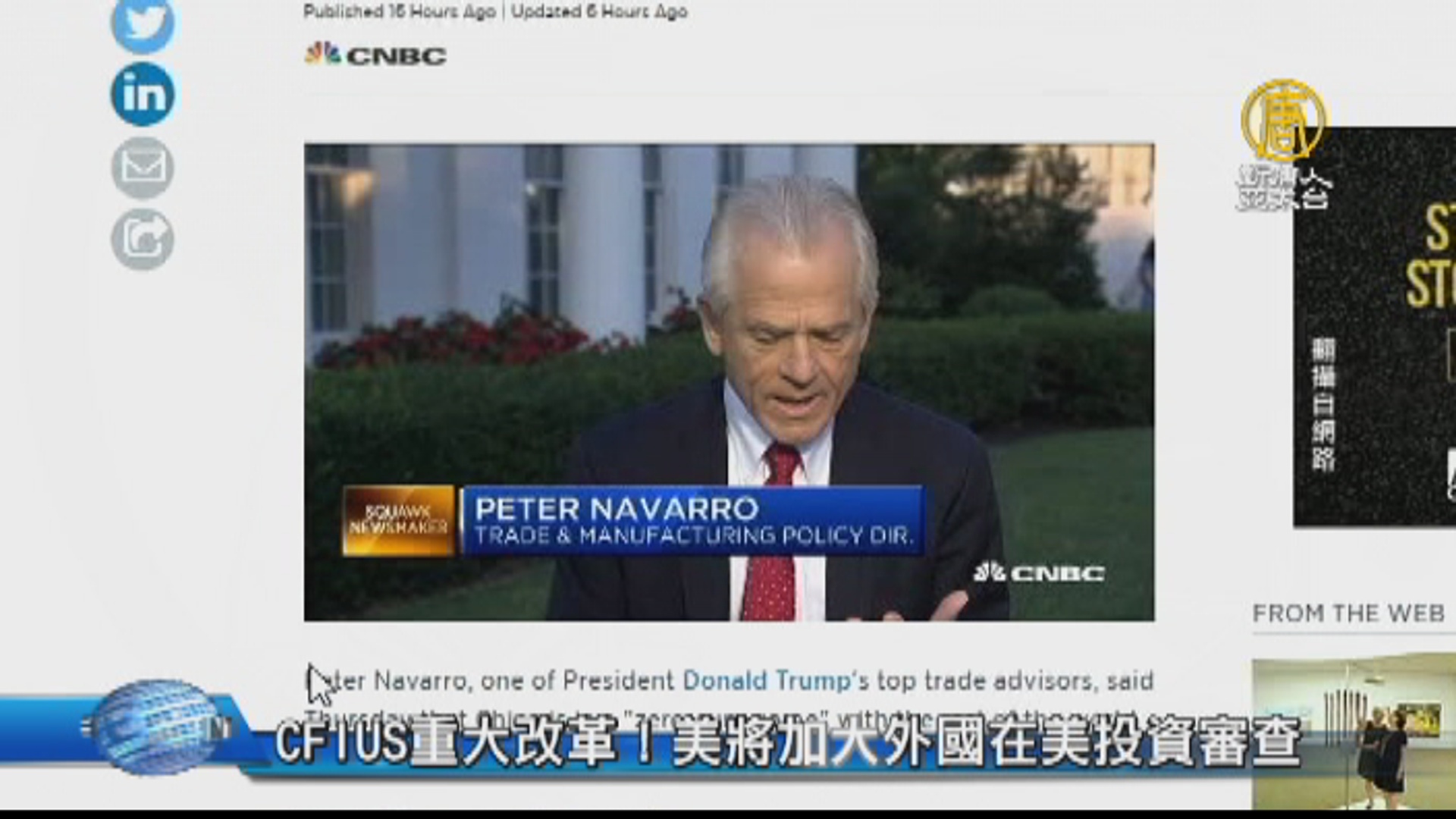 【新唐人亞太台 2018 年 07 月 20 日訊】新聞一開始,先來看到,美國國會將對美國外來投資審查委員會,做出十年來的重大改革!《華爾街日報》報導,美國參眾兩院敲定一項法案,將賦予這個機構(CFIUS)更大權限,加強對 外國在美投資,以及涉嫌對美國尖端技術海外交易的審查流程,來阻止可能危及國家安全的中國及其他外國投資交易,參議院共和黨黨鞭柯寧(John Cornyn)表示,最快這個月就能通過。白宮貿易顧問納瓦洛,也在CNBC的財經論壇上透露,國會的強烈信號,將阻止美國的高科技「被北京買到後,轉回中國」。