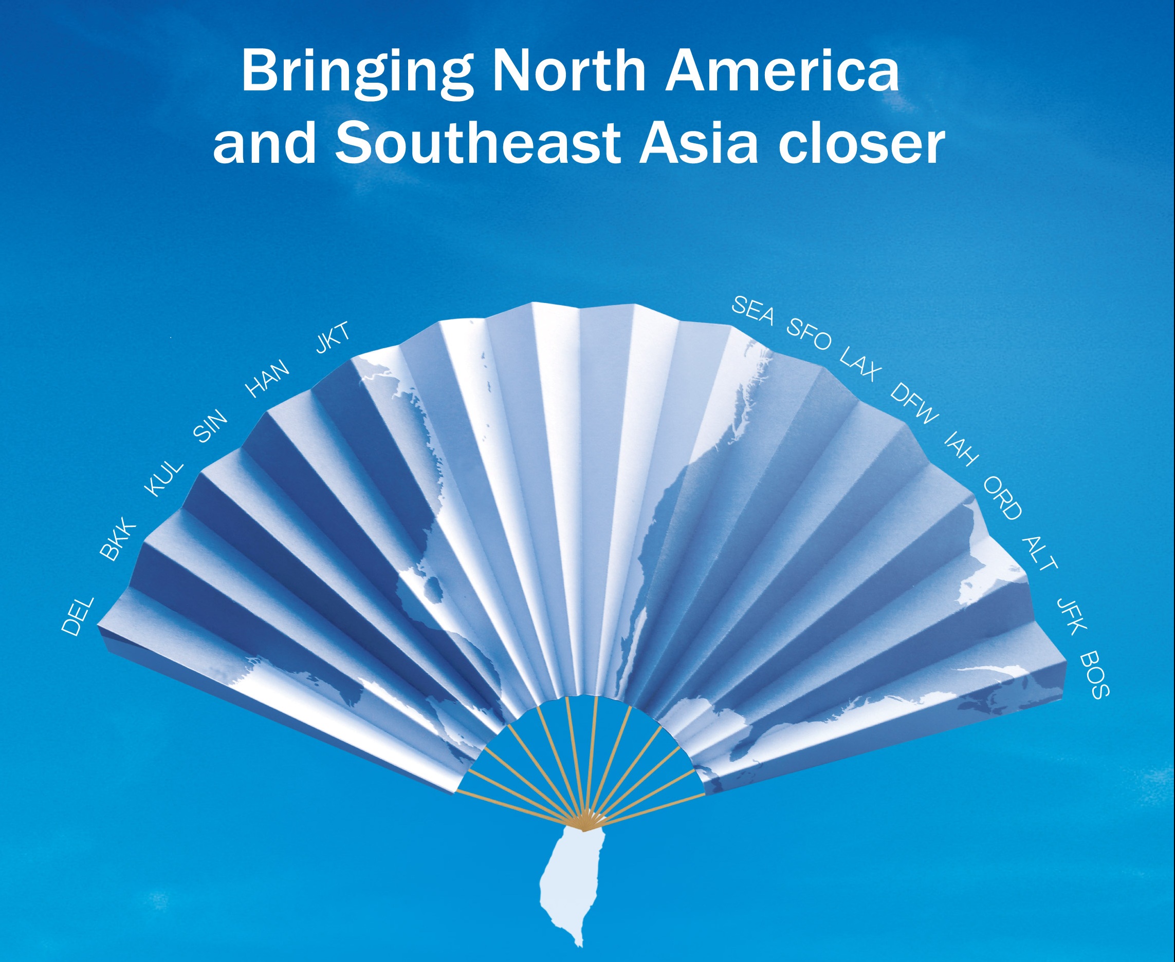 桃園機場獲獎的平面廣告曾刊登於Routes News、Airline Business Daily、Anna Aero及此次得獎的Air Transport World等國際刊物上,「摺扇篇」以代表東方文化的扇子作為主題,扇面上的地圖因扇子開闔而拉近距離,以臺灣優越的地理位置,傳達桃園機場為連結北美及東南亞最便捷的中轉樞紐意象,由西而東按照經度羅列出桃園機場飛行的主要機場,包括曼谷、新加坡、舊金山、芝加哥等地。