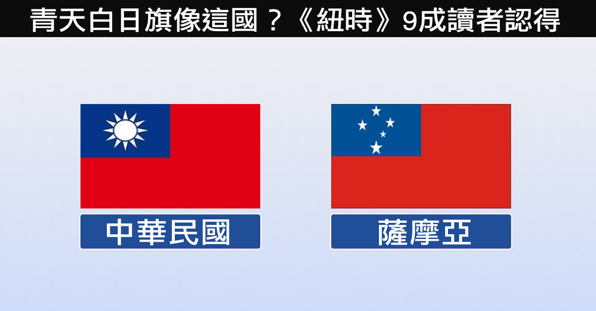 【新唐人亞太台 2018 年 07 月 26 日訊】紐西蘭近日指控澳洲,抄襲他們的國旗設計。對此,《紐約時報》報導說:其實紐澳兩國,並不是全球僅有的國旗相似國家。《紐約時報》還特別做了一組小測驗,考考讀者對國旗的常識,其中一張中華民國國旗下面,出現「台灣、薩摩亞、海地」的選項,網站上統計,有91%的讀者答對了這題。看起來,薩摩亞國旗與我國國旗比較相似,差異僅在左上方藍底中,薩國是五顆星星,而我國是國徽。薩摩亞位於南太平洋,全名是「薩摩亞獨立國」。