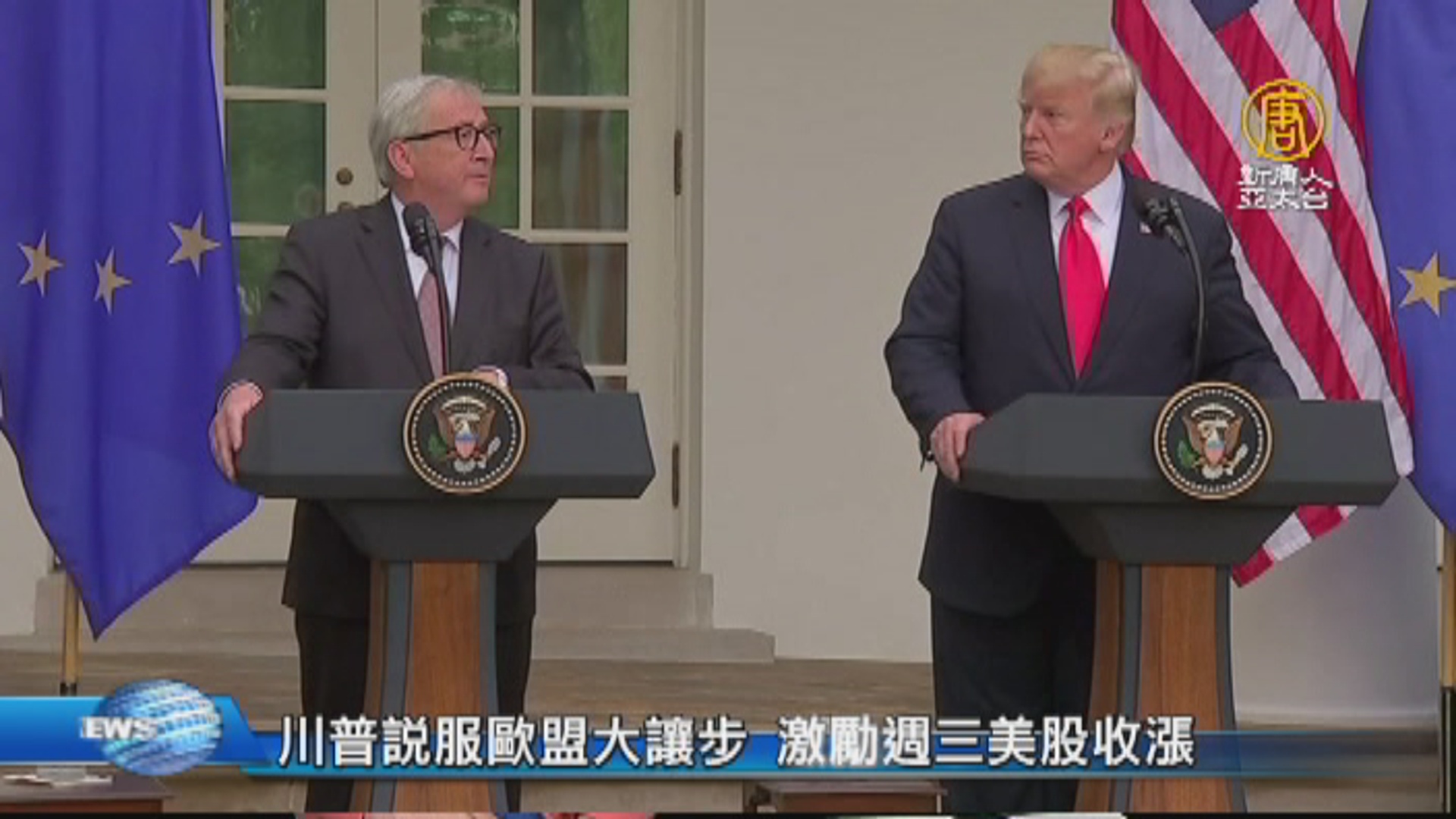 【新唐人亞太台 2018 年 07 月 26 日訊】好,美國總統川普,與歐盟委員會主席榮科,將近兩個小時的會談,同意致力降低貿易壁壘。美國總統川普順利說服歐盟,在貿易問題讓步,也激勵了週三的美股。