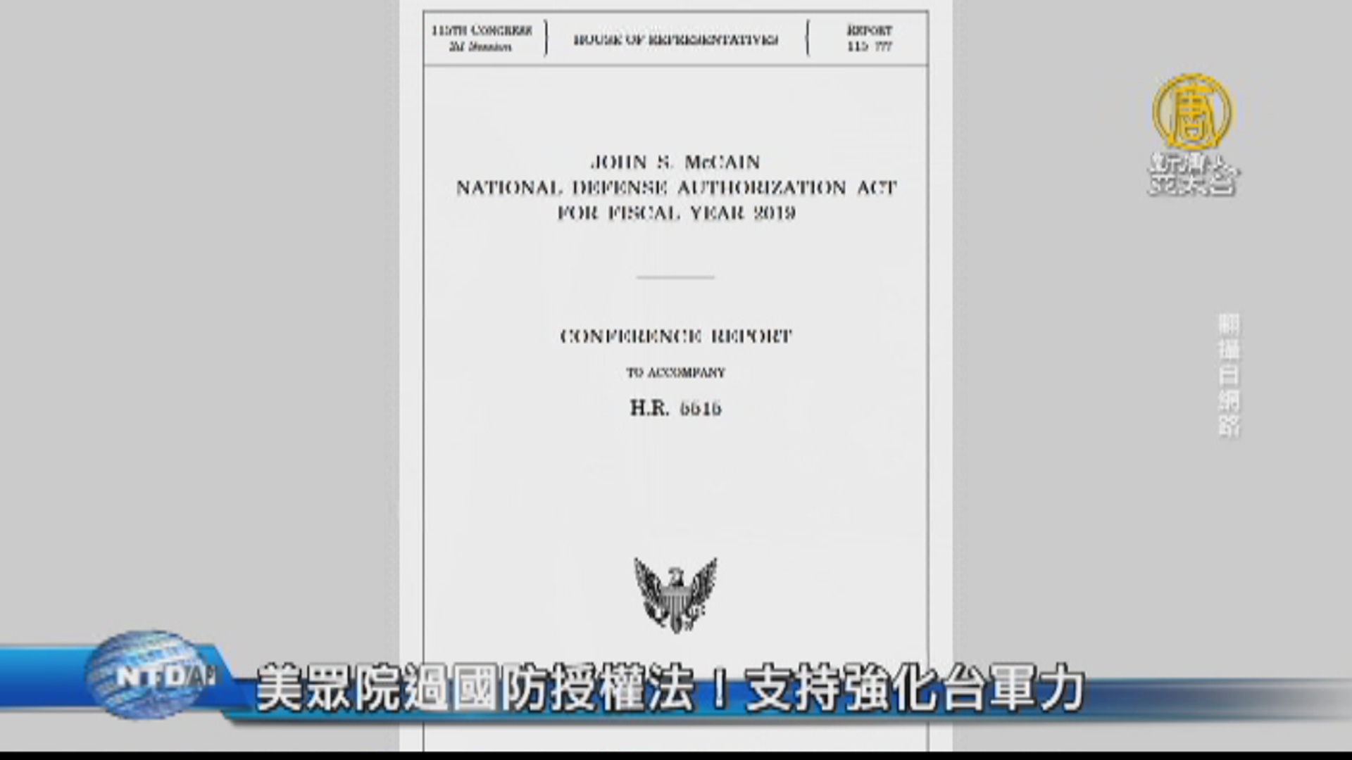 【新唐人亞太台 2018 年 07 月 27 日訊】歡迎回來。美國眾議院26號,以359票對54票,投票通過預算達7160億美元的《2019財年國防授權法》。支持強化台灣軍力,提高台灣的自我防禦能力,并促進美台高階國防官員與一般官員交流。接下來,法案還得通過參議院表決,再由美國總統川普簽署後,才會正式生效。