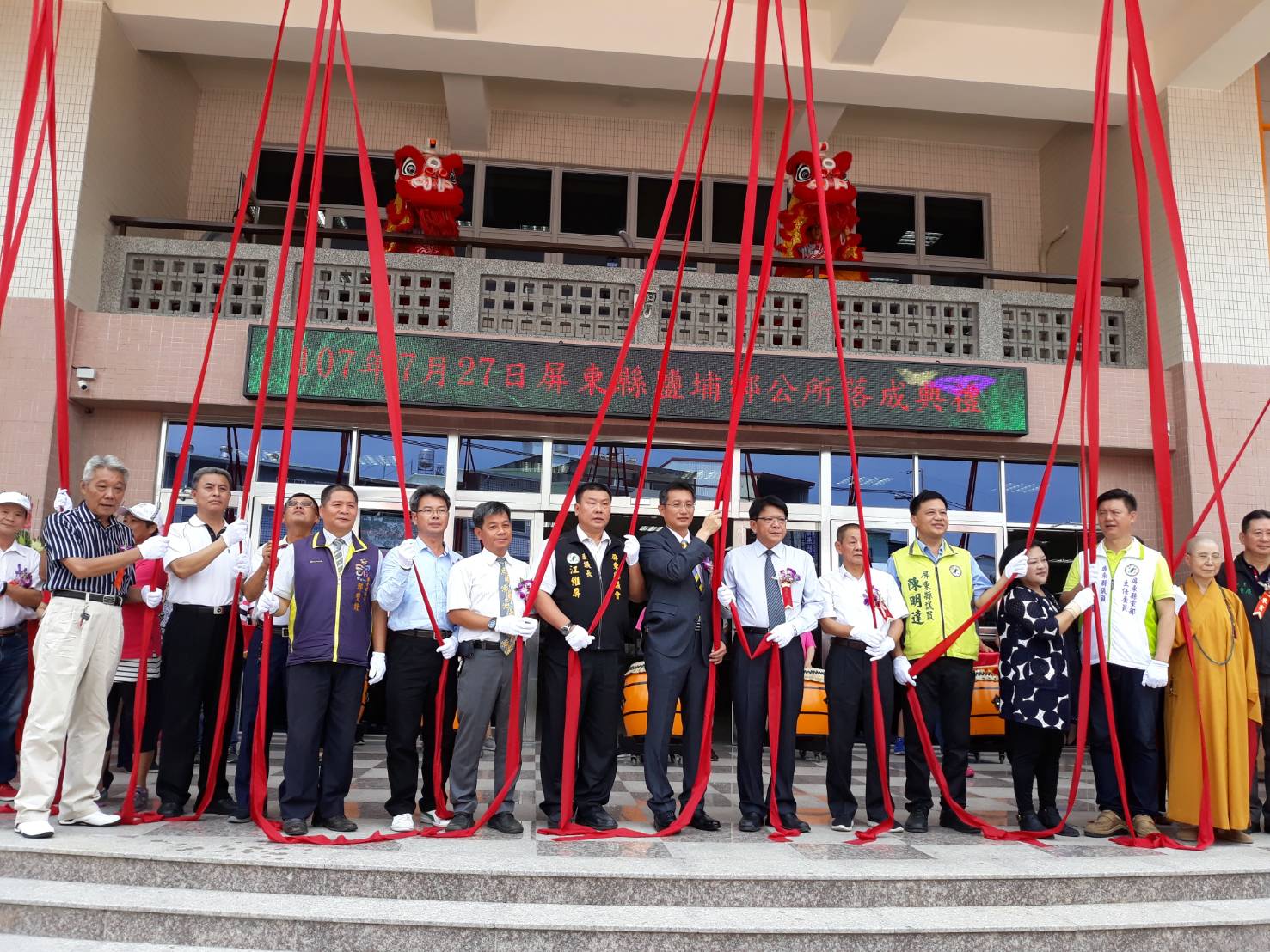 【新唐人亞太台 2018 年 07 月 28 日訊】屏東縣鹽埔鄉新建行政中心27日舉行落成啟用典禮,代理鄉長張平和主持剪綵。屏東縣長潘孟安親自慶賀表示,縣府將增設新設施,例如共融公園、親子圖書館,成為新的家庭福利服務中心。