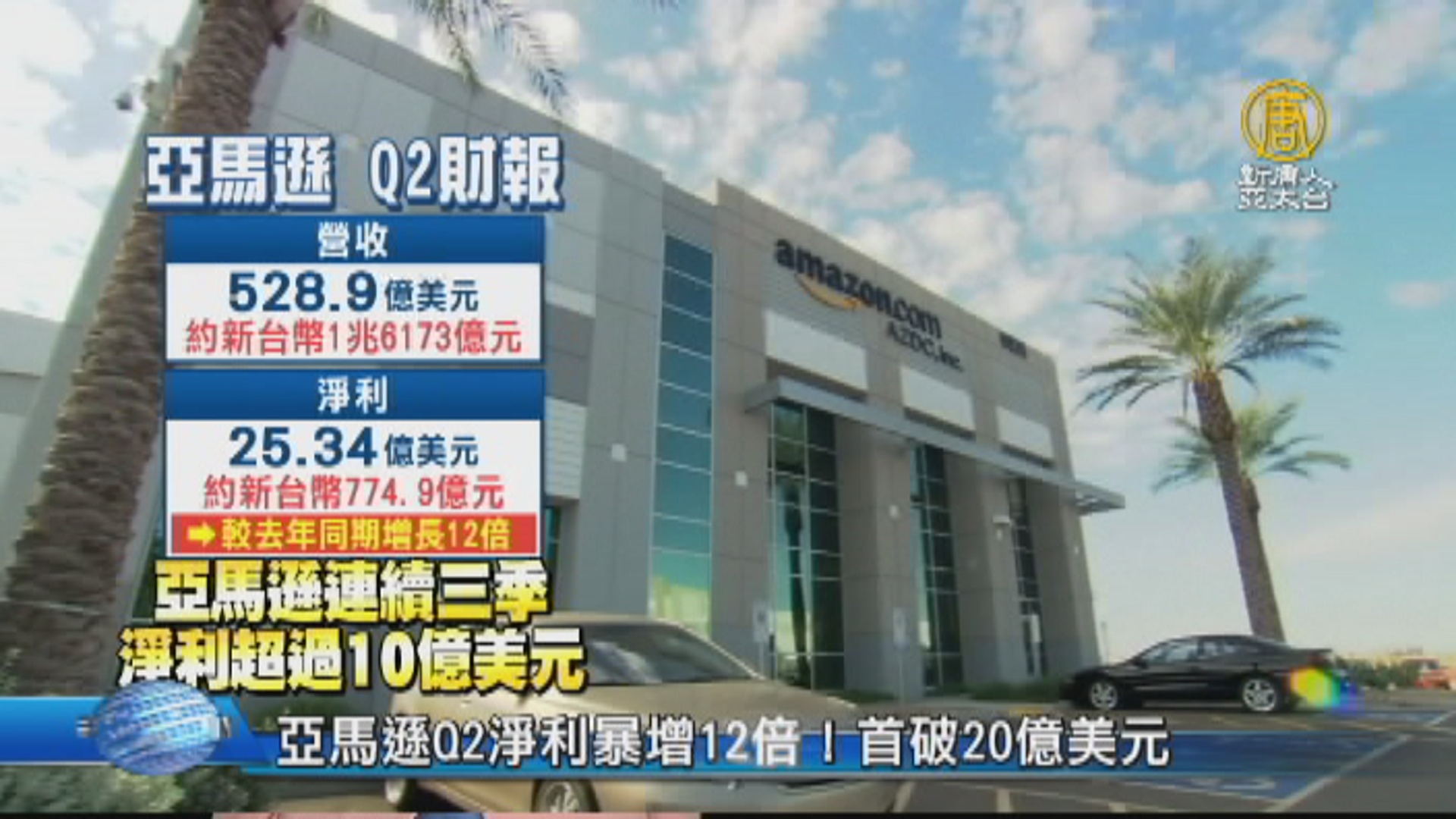 【新唐人亞太台 2018 年 07 月 28 日訊】全球電商龍頭亞馬遜,昨天公布第二季財報。本季營收為528.9億美元,約新台幣1兆6173億元。淨利更首次突破20億美元,相較去年同期,增長12倍。