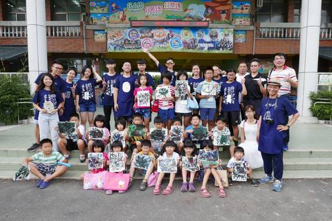 台中一中美術班美術老師鄭炳煌,日前帶領「彩虹森林學校」團隊回到故鄉嘉義鹿草鄉,開辦四天三夜的藝術營隊,指導全校只有21位學生的竹園國小,28日在社區貨櫃美術館舉辦成果展。