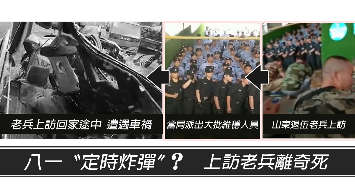 中共八一建軍節前夕,為防老兵大規模集結成「定時炸彈」,北京宣布提高部分退伍軍人待遇,同時加強對老兵群體的維穩力度。日前,大陸多地相繼發生老兵集結被圍堵事件,另有2名江蘇徐州老兵赴京上訪返回途中,遭遇車禍,離奇身亡。