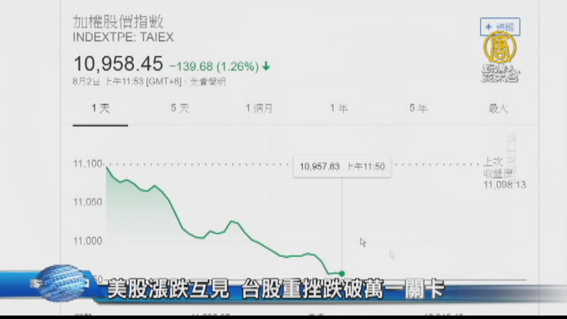 【新唐人亞太台 2018 年 08 月 02 日訊】好,美中貿易緊張局勢衝擊製造商股價,不過蘋果公司財報報喜,股價周三衝上歷史新高,支撐美國股市漲跌互見,科技股走強,帶動那斯達克指數收高。而台股則是受到多空影響,今天呈現大跌。台股加權指數,今天以11095.67點開出,隨後跌幅擴大,指數盤中跌破11000點大關,來到10977點,重挫120點,跌幅超過1%,分析師認為,後續台股走向,端看美中貿易戰最新進展,三大蘋果概念股,則是力守平盤,雖然偏弱,並沒有出現大跌現象。