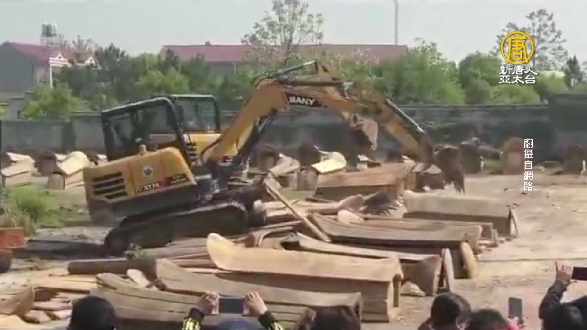 一鏟又一鏟,一排挖掘機同時搗向面前密密麻麻的棺木。還有更多被收繳的棺木,等待銷毀。