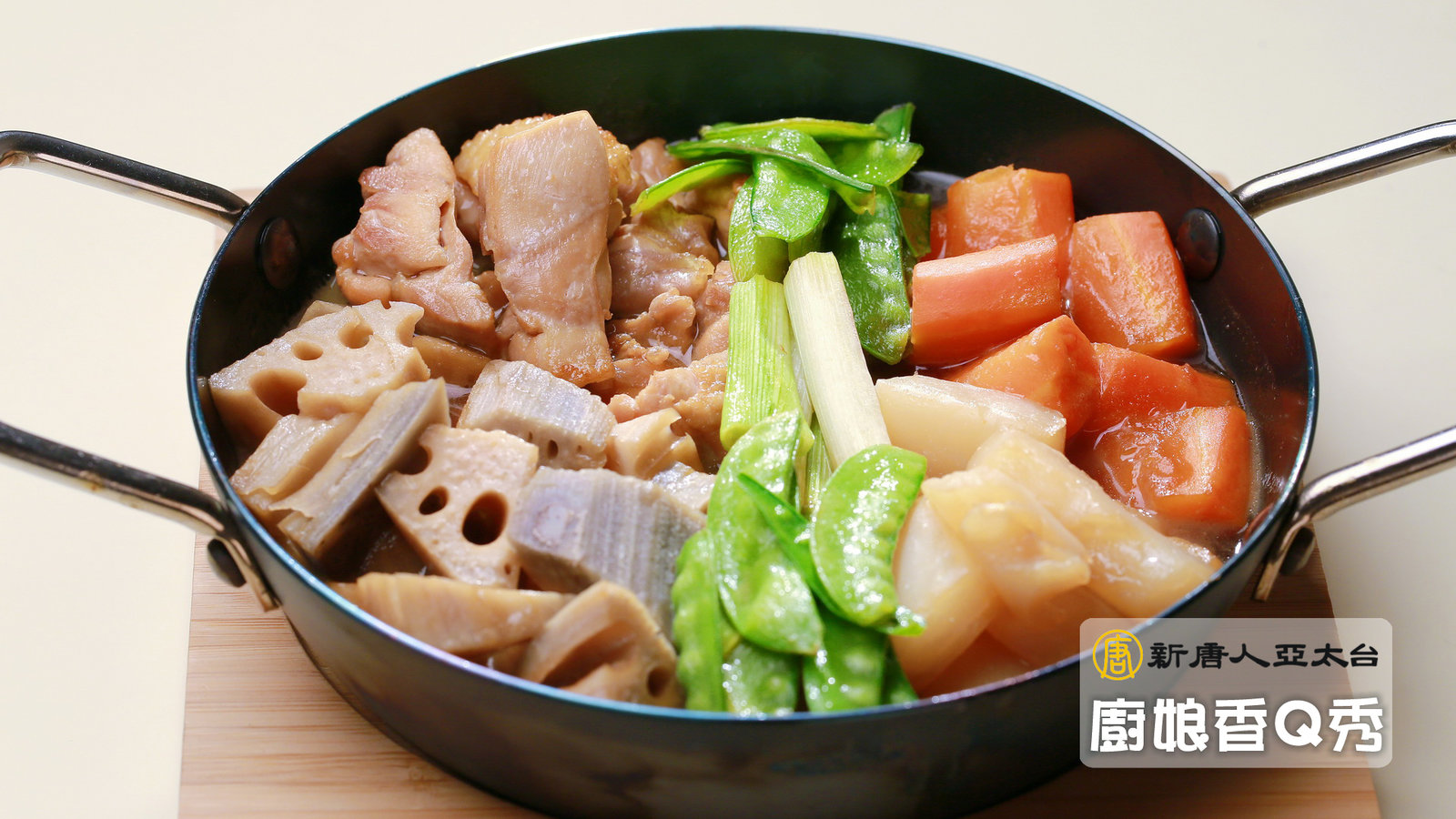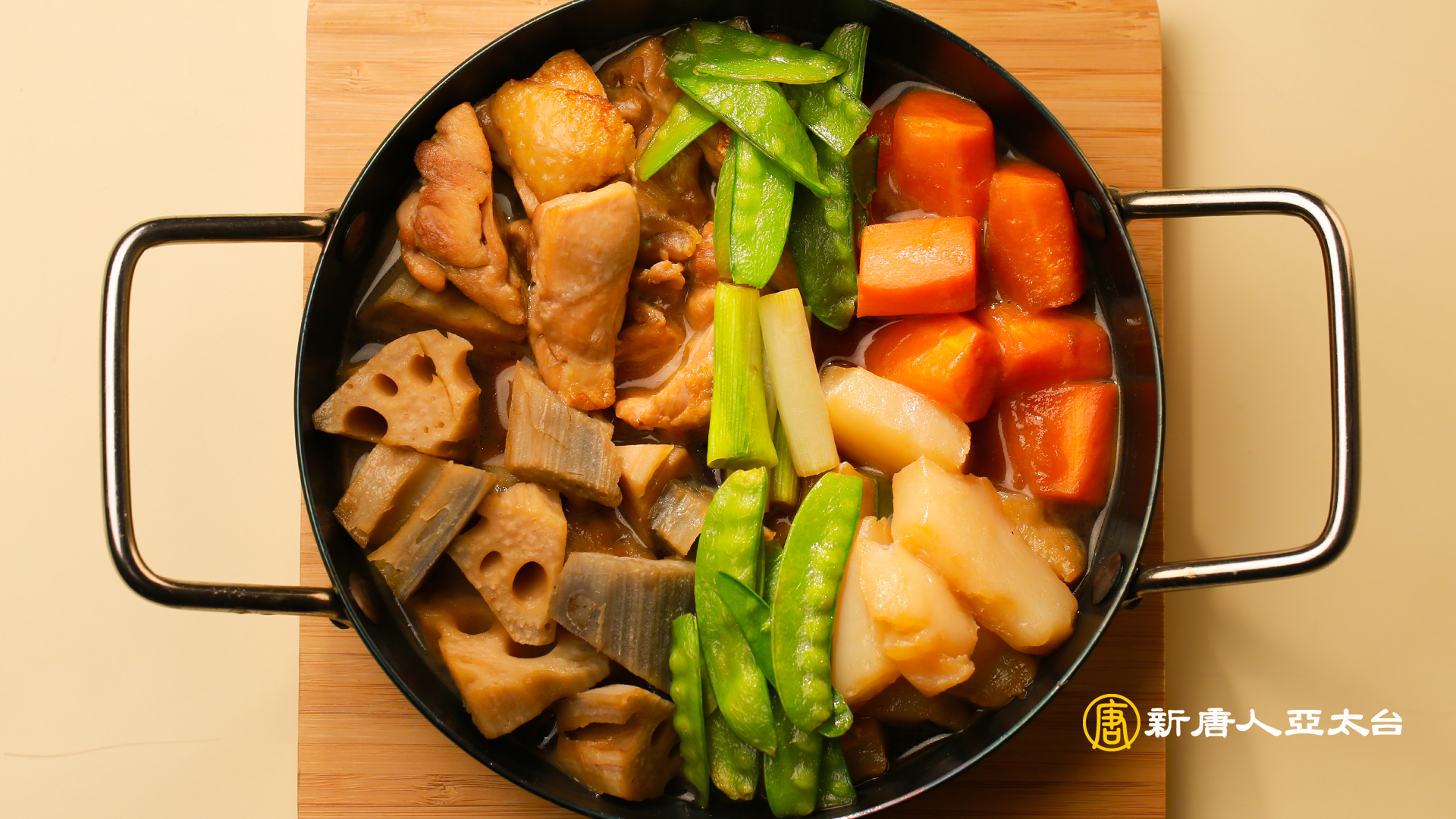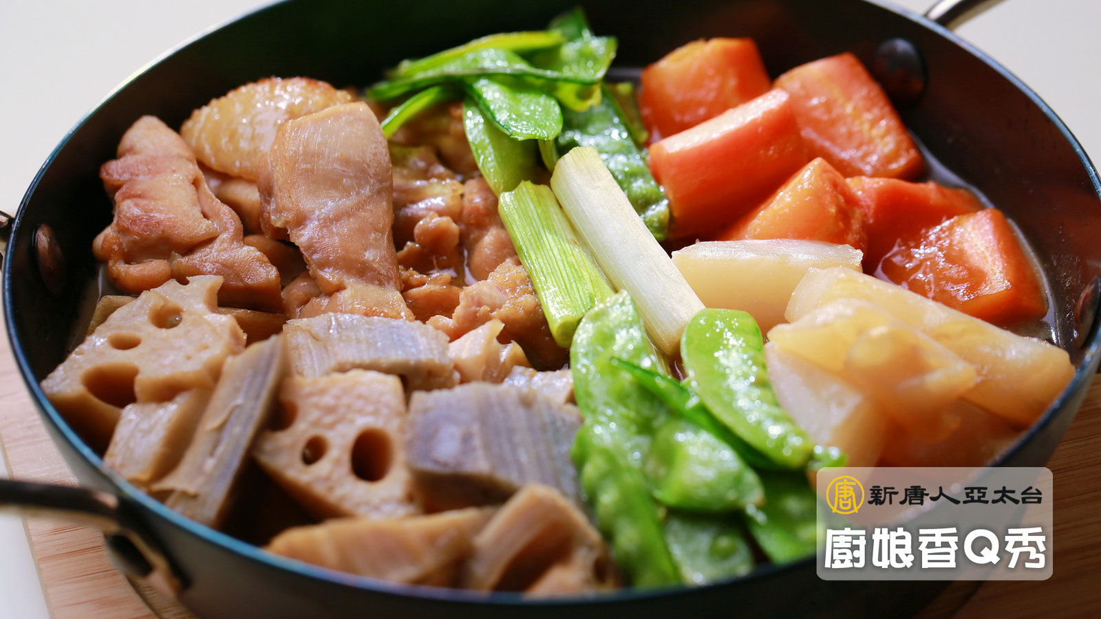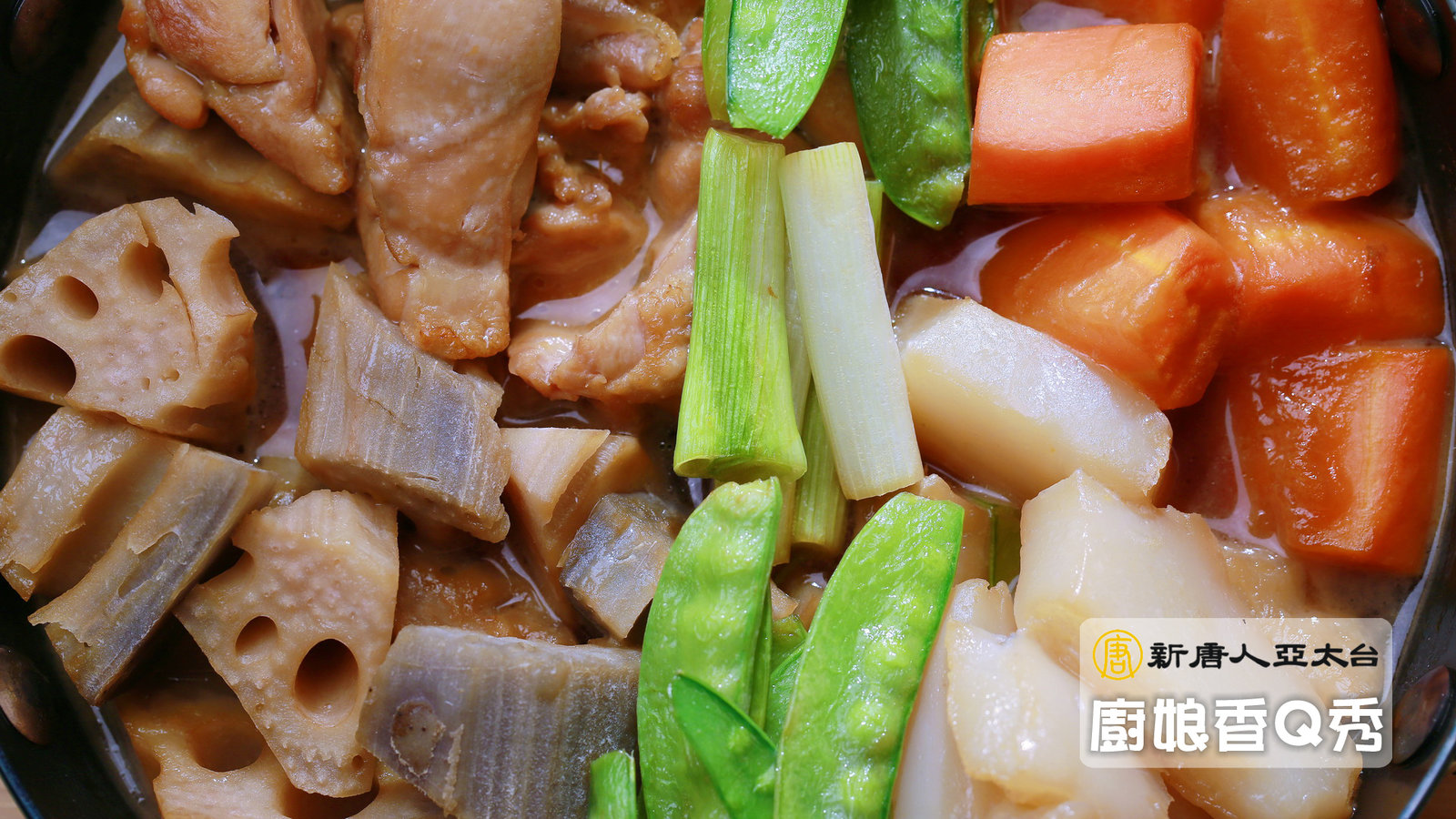 食材:雞腿肉1/2支、蓮藕200G、紅蘿蔔200G、蒟蒻1塊、甜豆筴5-6根
