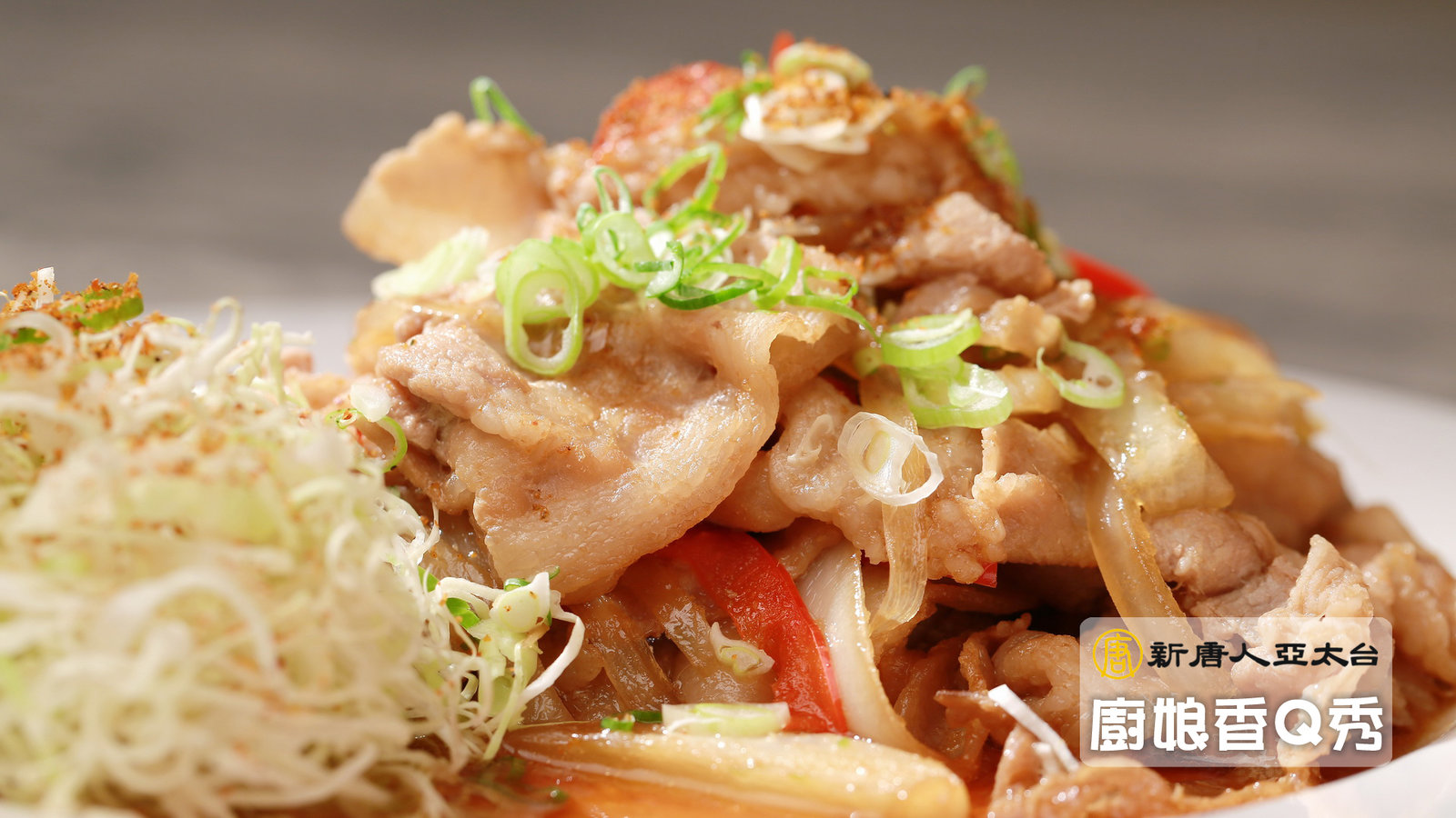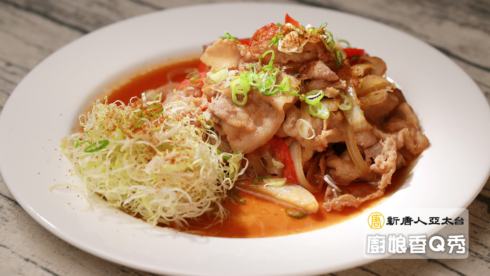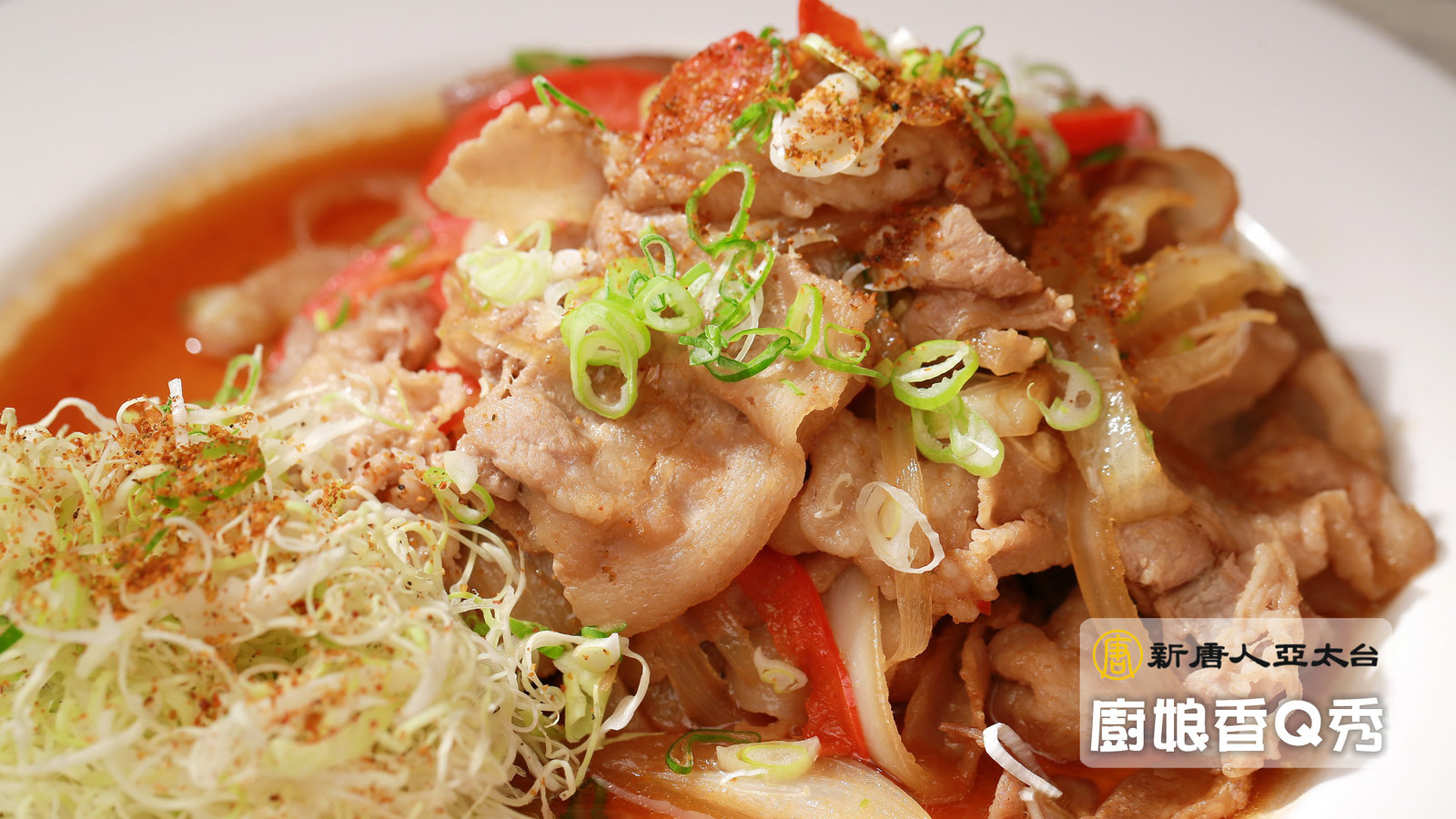 食材:豬五花肉片400G、洋蔥1/2顆(切條)、紅甜椒1/4顆(切條)、蔥花20G、白芝麻5G、七味粉適量