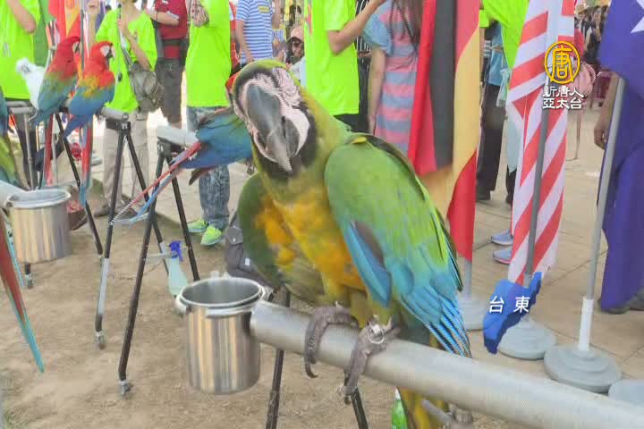 【新唐人亞太台 2018 年 08 月 04 日訊】暑假正值台東鹿野高台的熱氣球季,除了大批遊客來看熱氣球,還吸引鸚鵡愛好者帶著他們心愛的寵物鳥金剛鸚鵡來以鳥會友。飼主們一起在大草皮上放飛金剛鸚鵡,近40隻大型鸚鵡齊飛的盛況,讓遊客看了,直呼好壯觀。