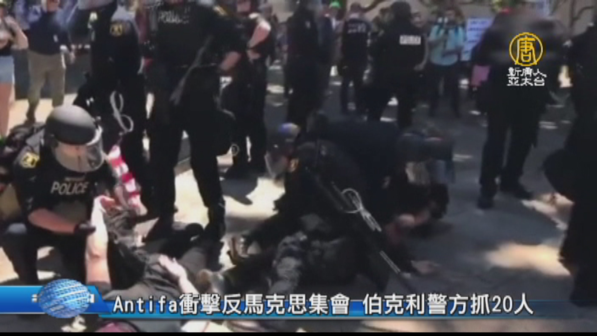 【新唐人亞太台 2018 年 08 月 07 日訊】好,再來把鏡頭轉到美國。8月5號上午,「反對共產主義滲透」、支持總統川普的人士,在灣區伯克利舉行了和平集會。卻遭到數百名號稱反法西斯的極左組織成員,暴力襲擊。伯克利出動大批警力維持秩序,並逮捕了至少20名暴力份子。