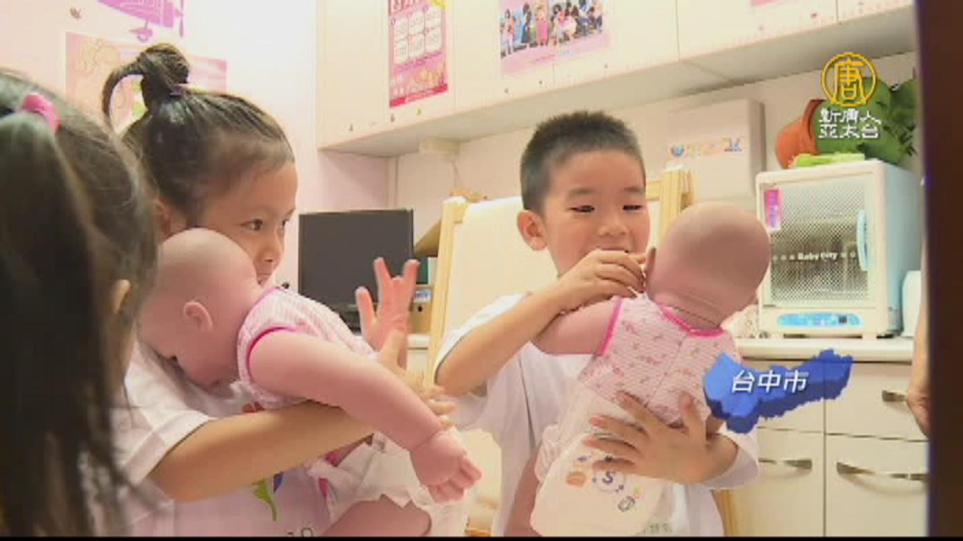 小朋友七手八腳,幫娃娃換尿布,每個動作都不馬虎,換完還不忘抱起來秀秀一番,體現大哥哥大姊姊的風範,但其實當中很多人,都是第一次體驗換尿布。
