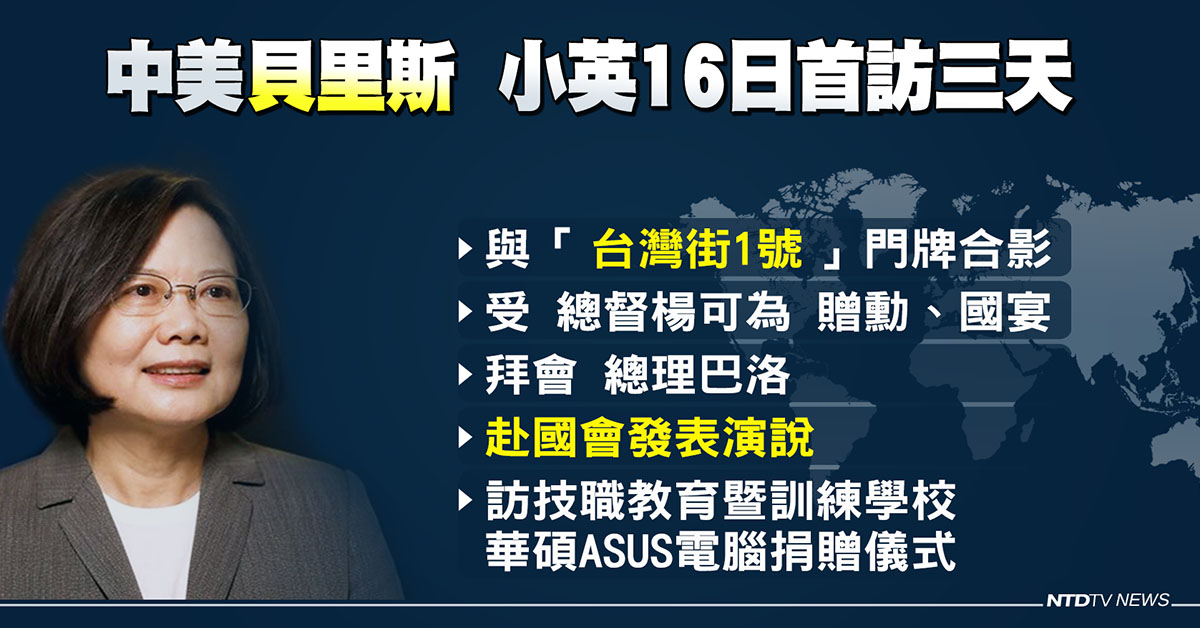 16日上午,蔡英文轉往貝里斯3天行程,包括與「台灣街1號」門牌合影、接受貝里斯總督楊可為贈勳及國宴款待,拜會貝里斯總理巴洛,到國會發表演說,參訪貝里斯技職教育暨訓練學校。