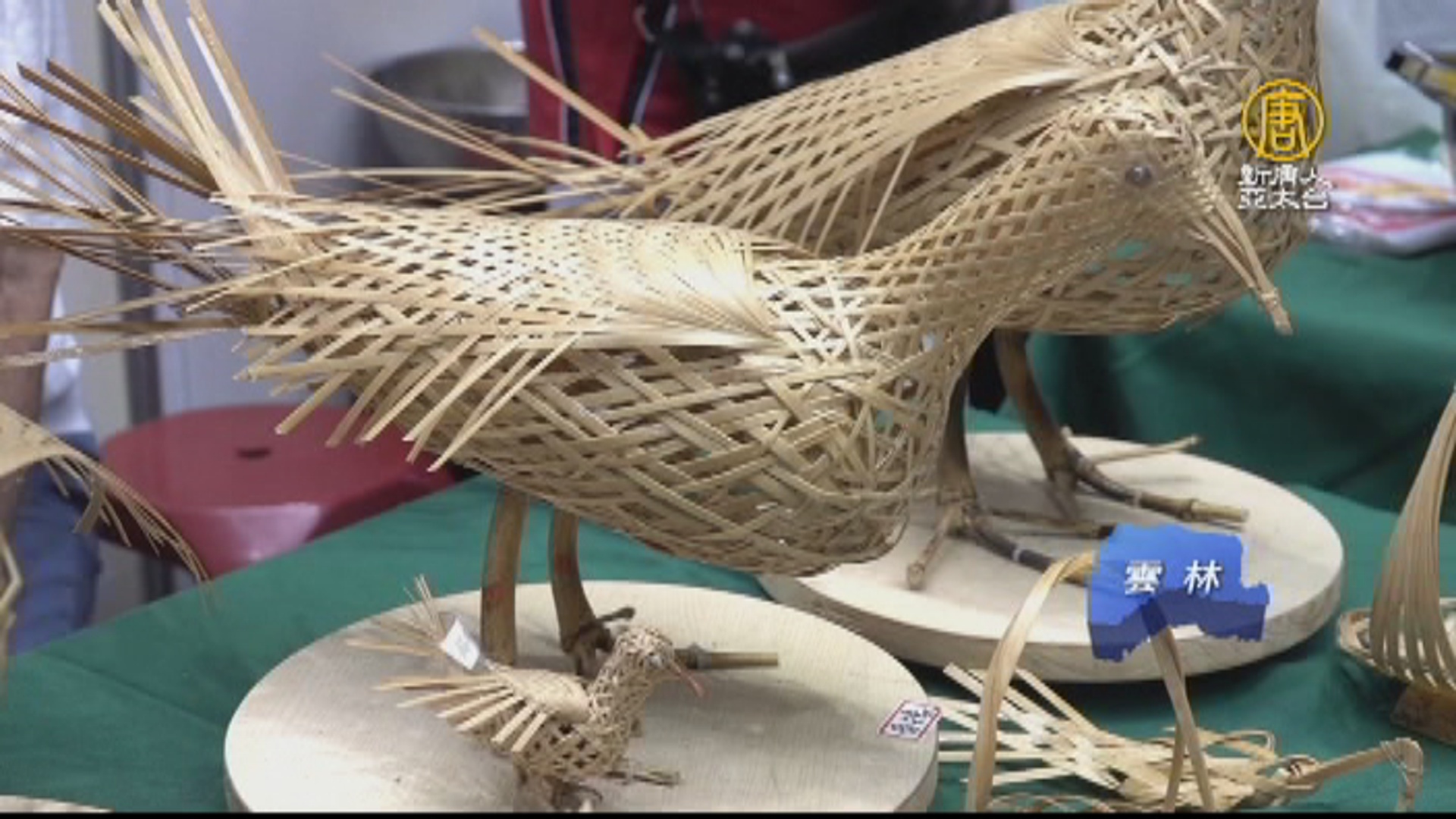 美麗的喜鵲在樹梢上、還有用甘蔗葉做的籃子、帽子、另外這隻台灣帝雉是用竹子做的,相當漂亮手工細膩,這些都是民眾在雲林社區PK賽中設計出來的作品。