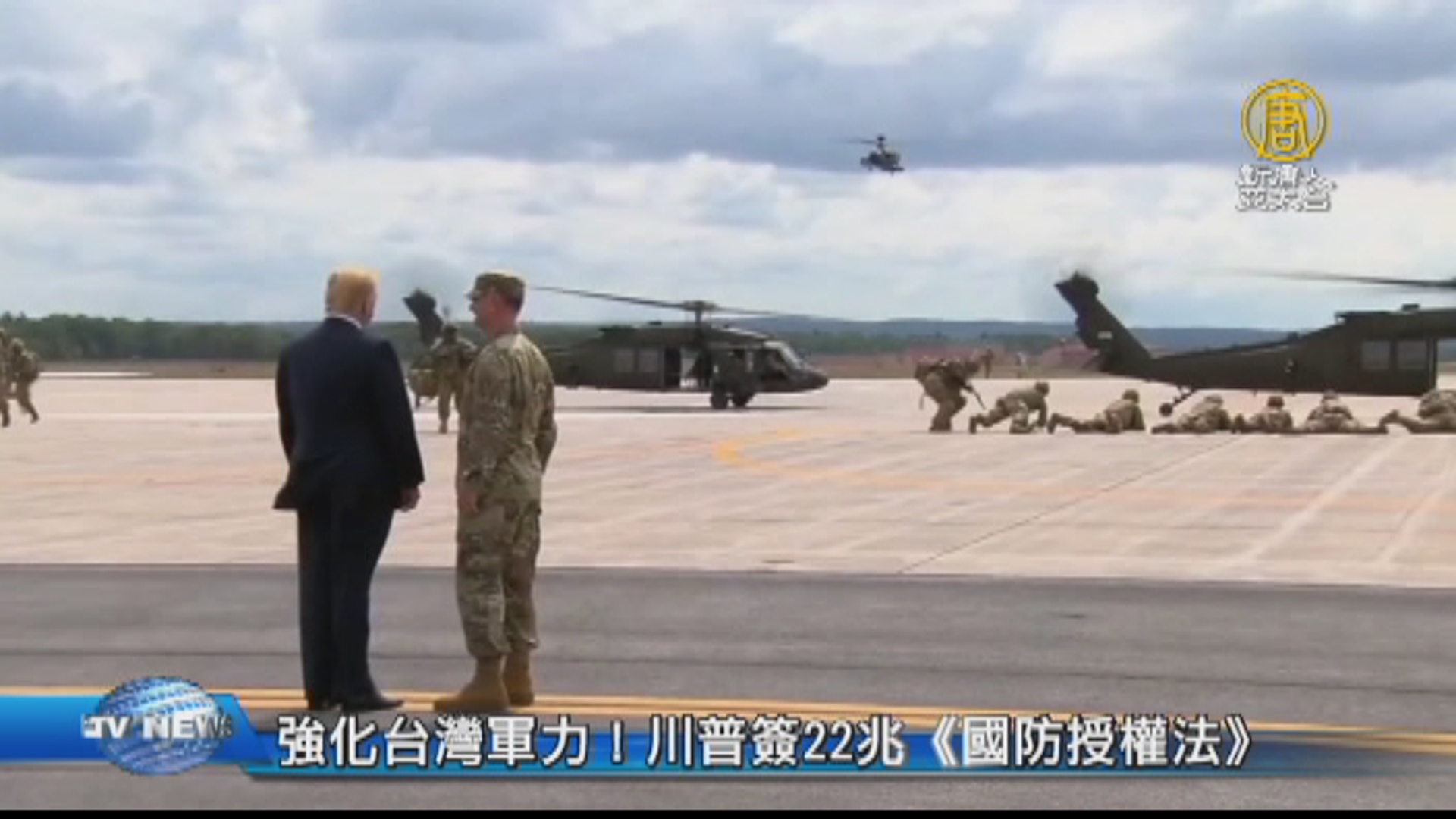 【新唐人亞太台 2018 年 08 月 14 日訊】再來看到,今天的另一個新聞焦點。美國總統川普,在台灣時間,今天凌晨,簽署了2019財年的《國防授權法》,批准軍事支出7170億美元,約22.12兆元台幣。這項法案還強化美台防務合作,除了充實台灣現有軍力外,也支持擴大聯合訓練、軍售,以及高階層級的 軍事交流。