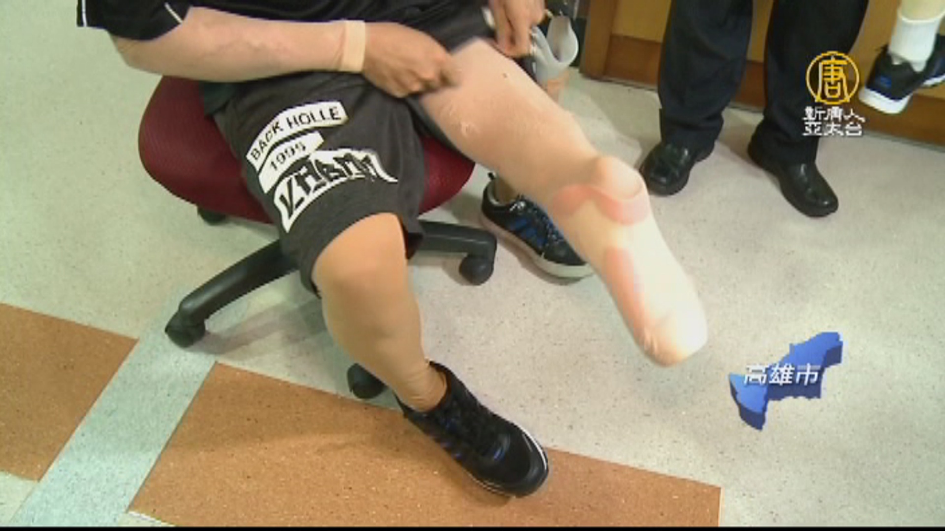 越南籍移工阿雖因為一場氣爆,左膝蓋以下斷裂、粉裂,截肢後裝義肢代步,他脫下層層鞋襪,露出原本左膝蓋的位置,現在接著自己原本的腳踝。