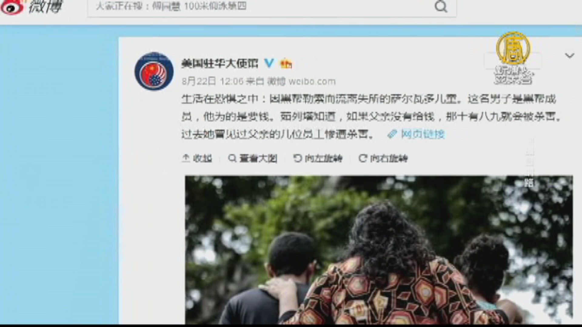 【新唐人亞太台 2018 年 08 月 23 日訊】中南美洲國家薩爾瓦多,與台灣斷交轉向中共,除了遭到美國國務院批評之外,美國駐北京大使館的發文也引起關注,美國使館的官方微博,昨天發出一段文字,關心因黑幫勒索而流離失所的薩爾瓦多兒童。不少中國網友質疑「薩爾瓦多跟台灣斷交前怎麼不見發聲?」認為發文時機太過巧合,似乎是要為台灣出一口氣。但事實上,川普早已多次針對薩爾瓦多的黑幫入侵美國,要求減少援助。另外,前美國副國務卿阿米塔吉,也發表聲明表示,台灣不應遭受脅迫,並應有保護主權與公民生計的權利。美國應在現有「一中政策」架構下擴大與台灣互動。