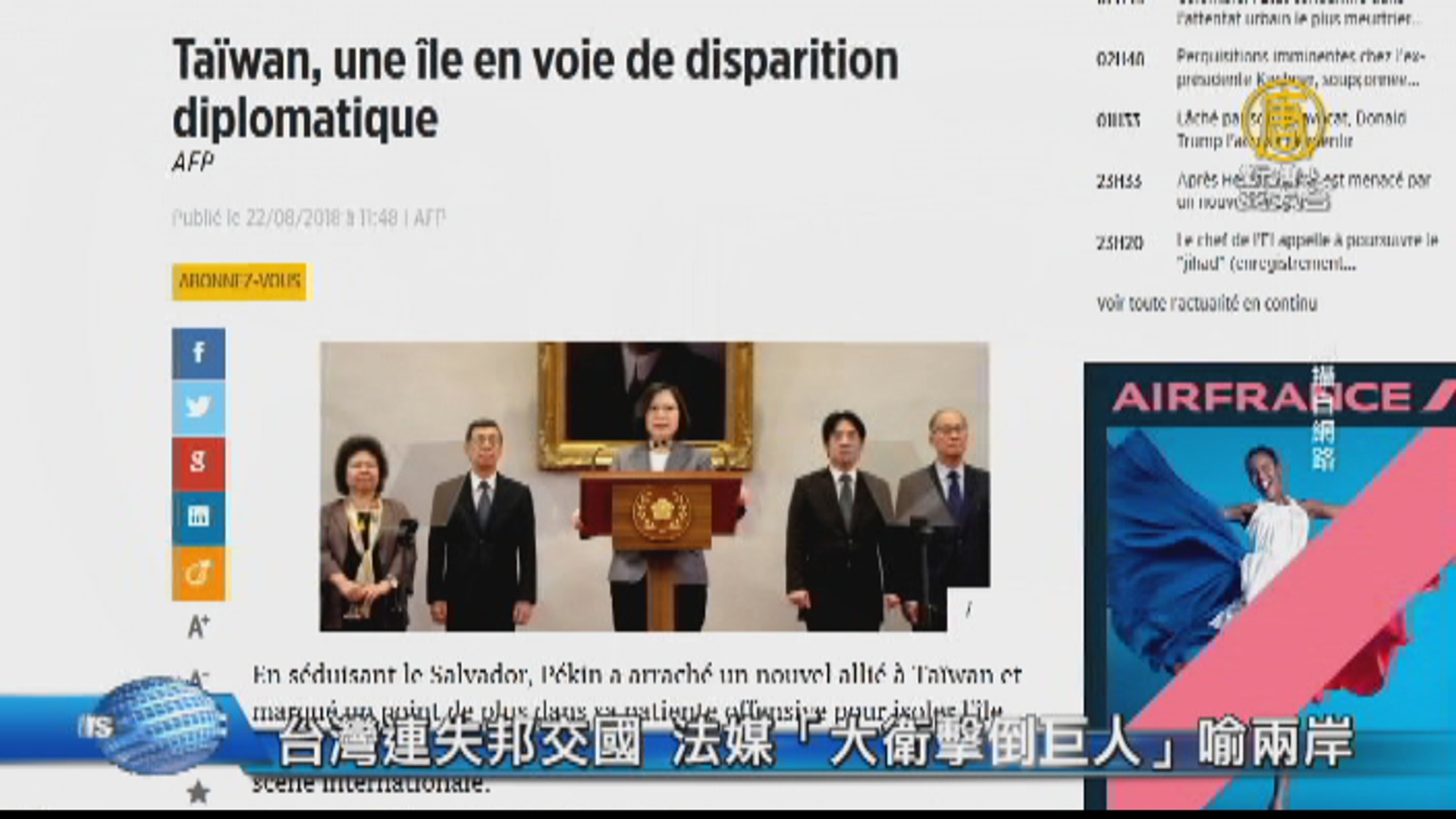 台灣連失邦交國 法媒「大衛擊倒巨人」喻兩岸