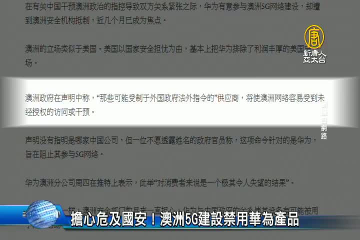 【新唐人亞太台 2018 年 08 月 23 日訊】好,馬來西亞取消與中共的一帶一路計畫,而澳洲政府,則是在今天(23日)正式宣布,基於國家安全考量,決定禁止有疑慮的外國廠商參與建置國內5G網路。外媒《路透》報導,華為參與澳洲5G開發,一直受到澳洲安全機構的質疑,澳洲政府發出聲明,表示任何供應商背後,如有外國政府直接干涉,澳洲將會中斷和供應商的合作。外界推測,澳洲政府指認的「供應商」,正是中國華為與中興公司。隨著多國擔心中共滲透下,對於中國投資、中企限制 日趨嚴格。澳洲禁用華為,也許將成為其他國家的參照。