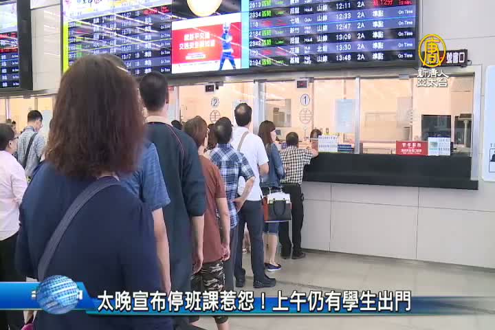 【新唐人亞太台 2018 年 08 月 24 日訊】台中地區,昨晚11點緊急宣布停班停課,雖然一直到凌晨六點左右,都有明顯雨勢,但天亮以後,雨勢稍稍緩和,只有零星的小雨,台中火車也正常行駛,讓民眾覺得是不是賺到了一天豪雨假期呢?不過還是要提醒民眾,氣象局持續發布豪雨特報,不排除瞬間豪大雨。另外,彰化、南投,因為半夜才宣布停班停課,部分家長和學生都已經睡了,沒有注意到訊息,一早趕到學校後才知道停課,相當無奈。